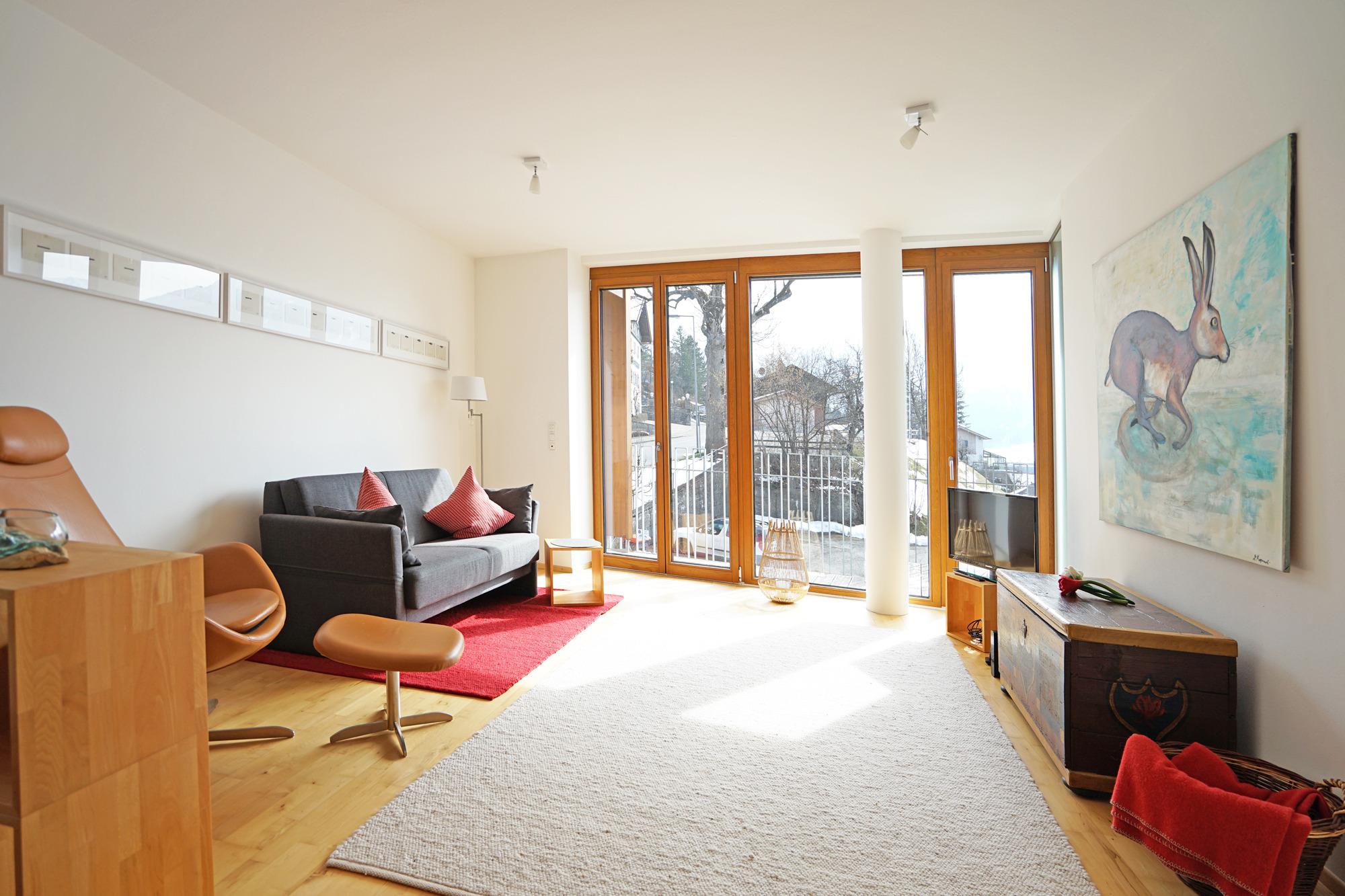 Die Wohnung "Sonnenfreude" ist ein Licht durchflutetes und freundlich eingerichtetes Ferienapartment, in dem man sehr gerne seine Ferien verbringen möchte. Sie ist ideal für 2 Personen und lädt zum Wohlfühlen, Relaxen und Entspannen ein. Diese hübsche Wohnung befindet sich im 1. Obergeschoss eines in moderner Architektur erbauten Mehrfamilienhauses. Diese komfortable Ferienwohnung besticht mit seinem offenen und sympathischen Wohn-/Ess-/Küchenbereich mit herrlicher Aussicht auf den Breitenberg, ein Schlafzimmer mit Doppelbett, einen direkt ans Schlafzimmer grenzenden begehbaren Kleiderschrank und ein modernes Badezimmer mit bodengleicher Dusche. Ein sonniger Balkon mit Blick auf die Berge und ein Tiefgaragenplatz runden dieses Angebot ab. Erholung und rundum wohlfühlen ist hier garantiert, genießen Sie ihren wohlverdienten Urlaub.