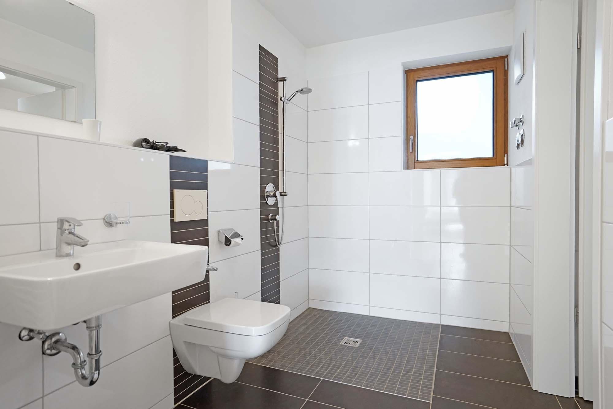 Bad mit begehbarer Dusche, WC, Waschbecken, Spiegel und Fön