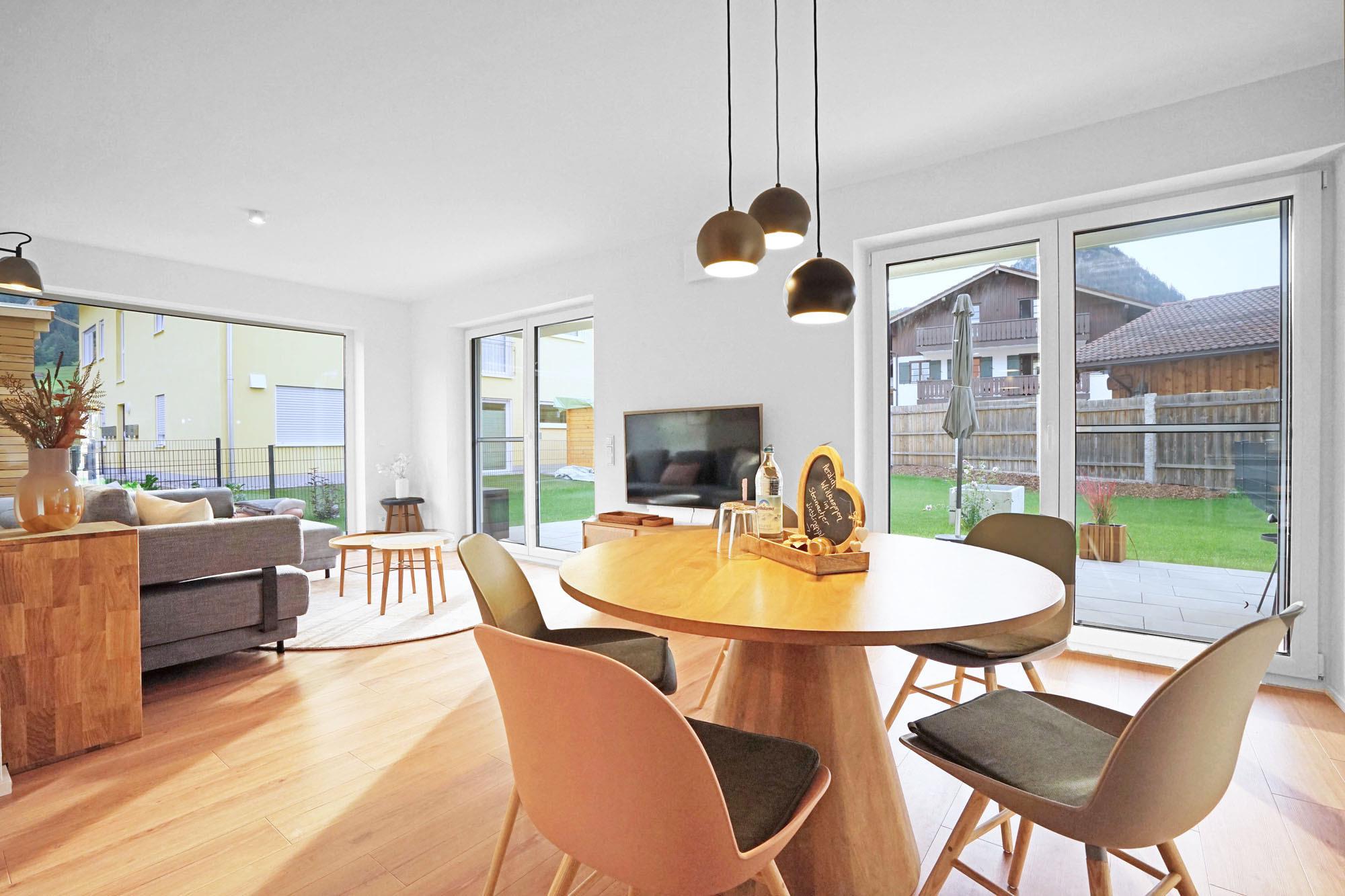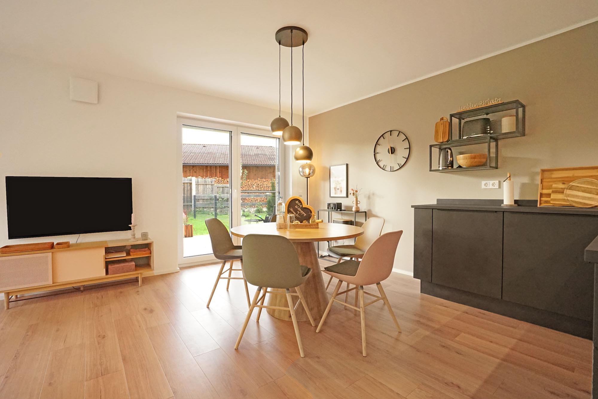 heller offener Wohn-/Essbereich mit integrierter Küche und Zugang zur Westterrasse,