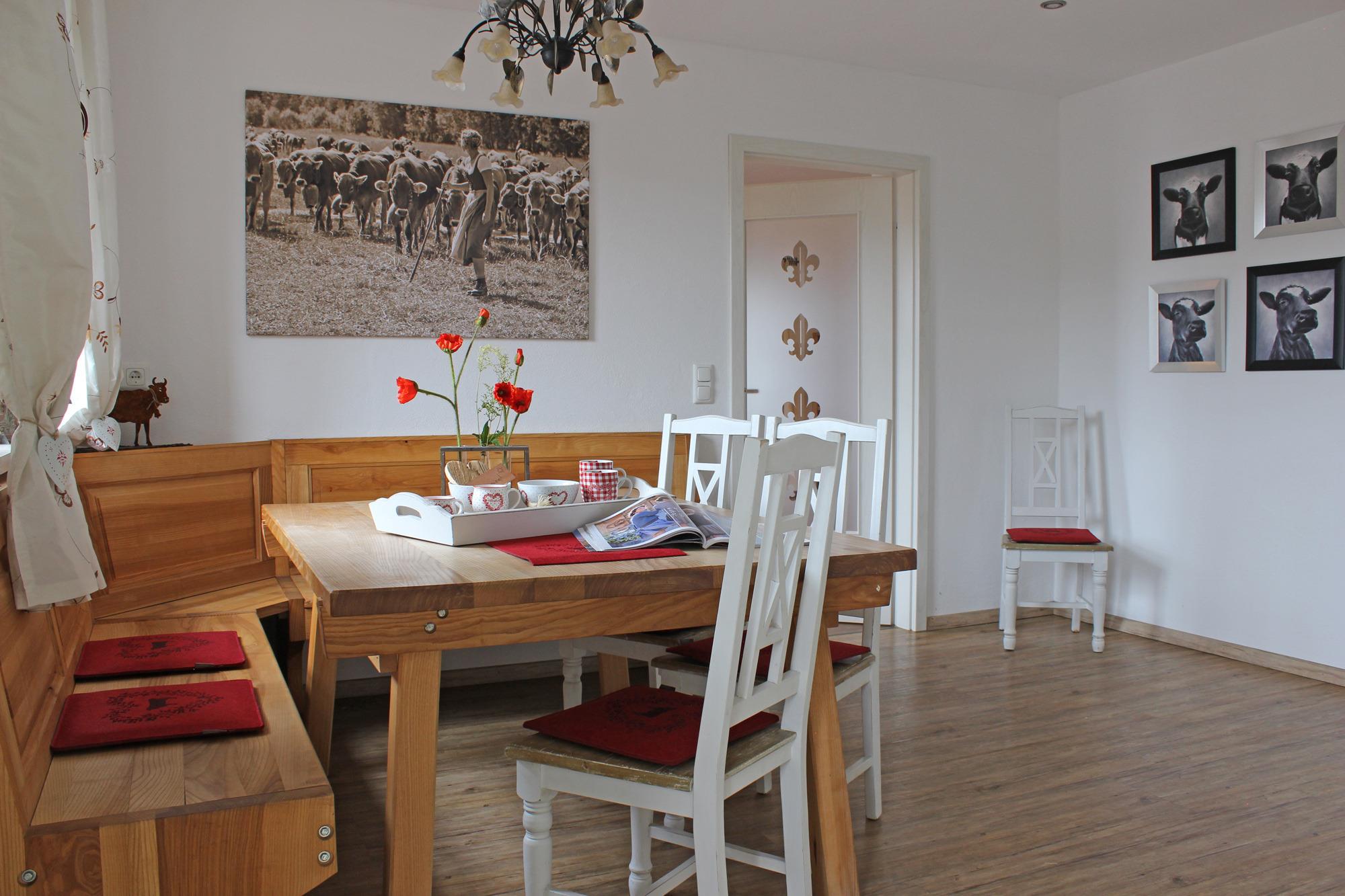 Die gemütliche ca. 130 m² große 3,5-Zimmer-Wohnung, ist ideal für 4-6 Personen und befindet sich im 2. Obergeschoss eines aktiv bewirtschafteten Bauernhofes, mit eigenem Zugang. Mit 2 Zustellbetten können bis zu 8 Personen beherbergt werden. Der lange Ostbalkon, ideal zum Frühstücken, mit schönem Blick in die Allgäuer Alpen. Täglich frische Milch direkt vom Bauernhof. Was will man mehr. Ein Kinderspielplatz liegt fußläufig in nur 2 minütiger Entfernung. Auch ein Besuch im Stall ist mit Voranmeldung zu den abendlichen Fütterungszeiten möglich. Gerüche, Geräusche und Kuhglocken gehören hier zum puren Landleben dazu.