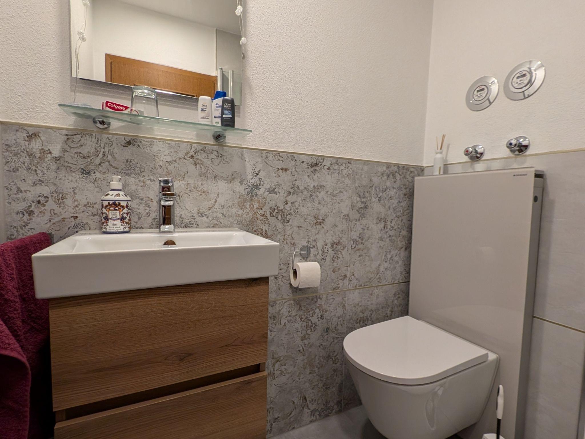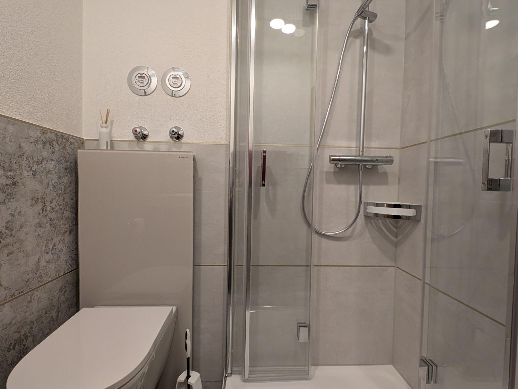 Im komplett renovierten Badezimmer befindet sich eine Dusche mit Raindancer, WC, Waschbecken, Einbauradio und Fön.