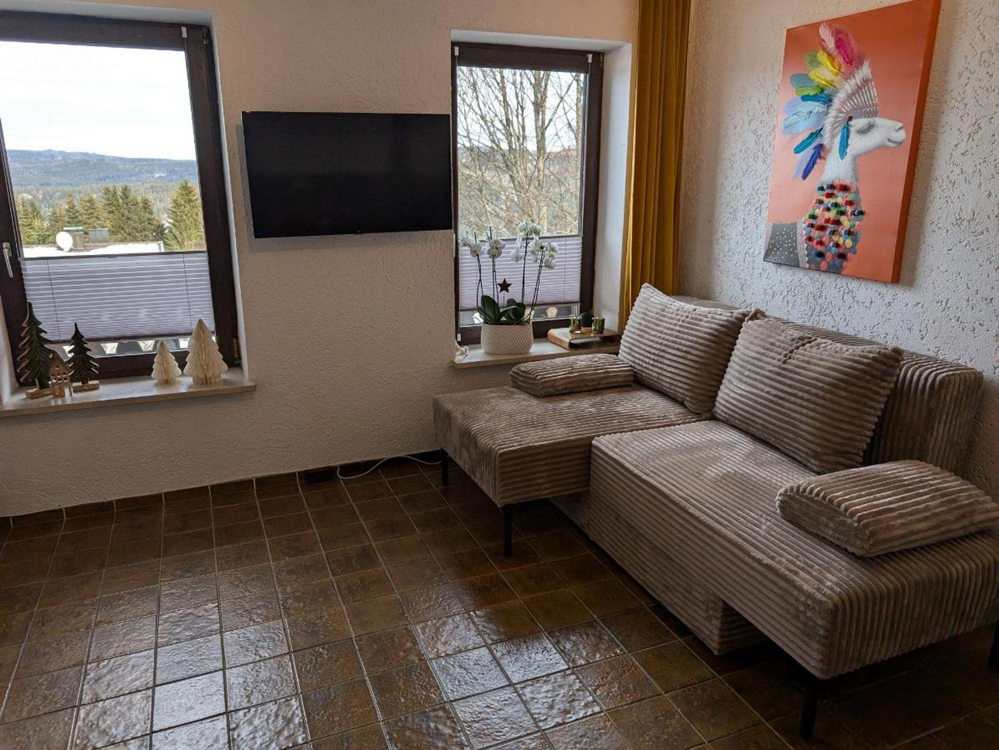 Die gemütliche 1,80 m Breitcord-Couch lädt ein sowohl zum Sitzen, Liegen kann aber auch als Schlafcouch für zwei weitere Personen verwendet werden. Zwei verstellbarer Flat-TV (WOhnzimmer und Schlafzimmer) mit unterschiedlichen streaming-diensten ist ebenfalls vorhanden.