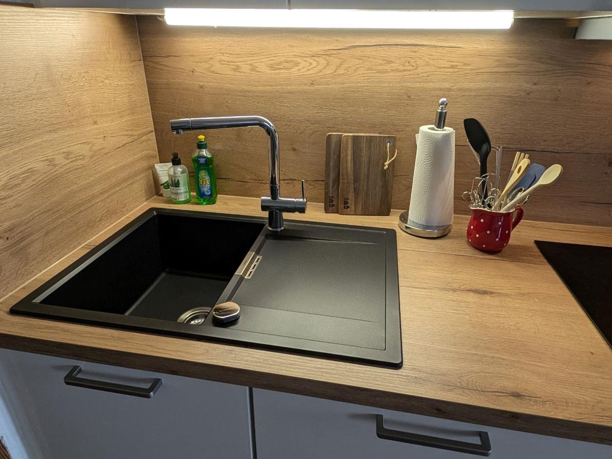 Die nagelneue Küchenzeile ist komplett ausgestattet mit einem AEG Induktionsherd sowie dem entsprechenden Backofen. Eine freistehende Kühl-/Gefrierkombination bietet genug Platz für den Einkauf. Des Weiteren sind eine große Spülmaschine, ein Sandwich Maker, Nespressomaschine, Induktionmilchaufschäumer (auf Wunsch kann auch eine Filterkaffeemaschine gestellt werden), Toaster, Handmixer sowie alle üblichen Küchenutensilien, mehr als ausreichendes Besteck sowie Geschirr vorhanden. Salz, Pfeffer, Zucker, Öl, diverse Teebeutel, Gewürze etc. sind ebenso vorrätig.