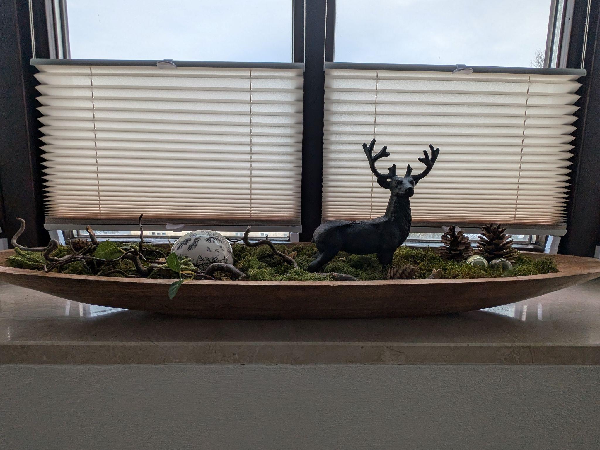 An den Fenstern befinden sich Fliegengitter. Im Wohnbereich lassen sich die beiden Fenster mit modernen Vorhängen sowie Plissees oder auch mit den außen installierten Holzfensterläden bedarfsgerecht abdunkeln.