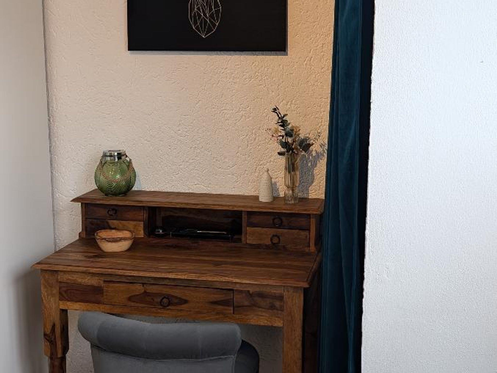 Im Schlafzimmer befindet sich ein bequemes 180 x 200 cm Boxspringbett aus kuscheligem Cord, rustikale Nachttischchen mit Leselampen und ein weiterer Streaming-Flat-TV. Ein beleuchteter 200 cm hoher Schrank bietet ausreichend Platz für die Kleidung (im Winter auch für Skikleidung). Genügend Platz für ein Kinderreisebett ist ebenfalls vorhanden (kann auf Anfrage unentgeltlich zur Verfügung gestellt werden). Ein kleiner Sekretär bietet Platz für anfallende Schreibarbeiten.