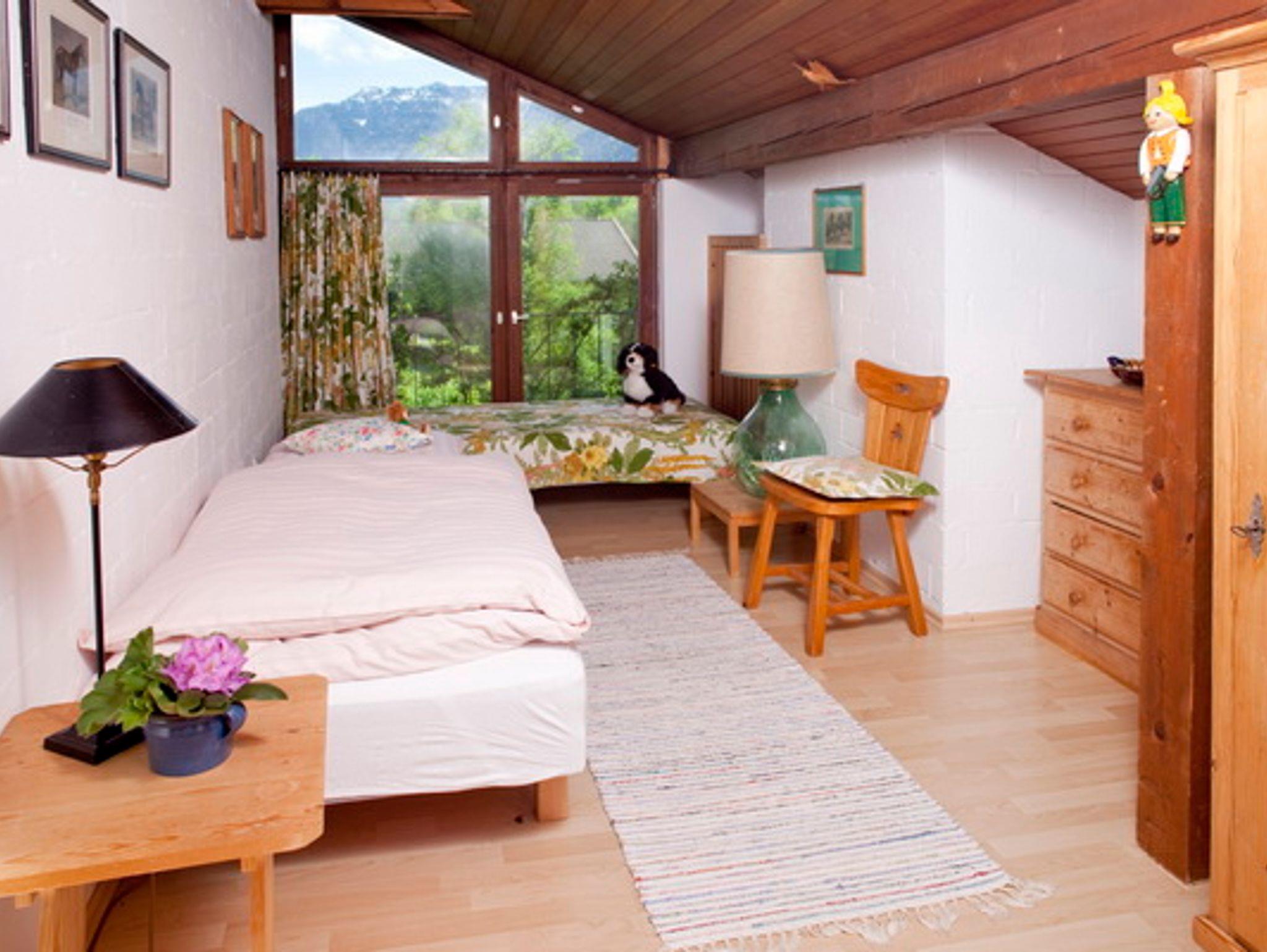 Die Wohnung im Dachgeschoss hat große Panoramafenster nach Osten mit Sonnenaufgang über dem Untersberg und Sonnenuntergang über dem Hochstaufen. Zwei geräumige Schlafzimmer können 4 Personen beherbergen. Ein Babybett kann jederzeit zugestellt werden.