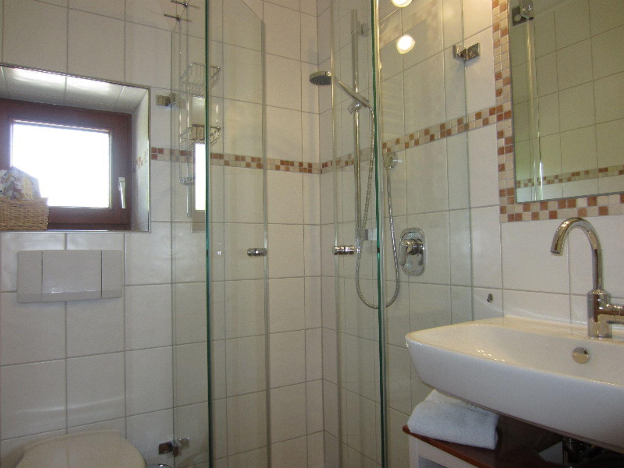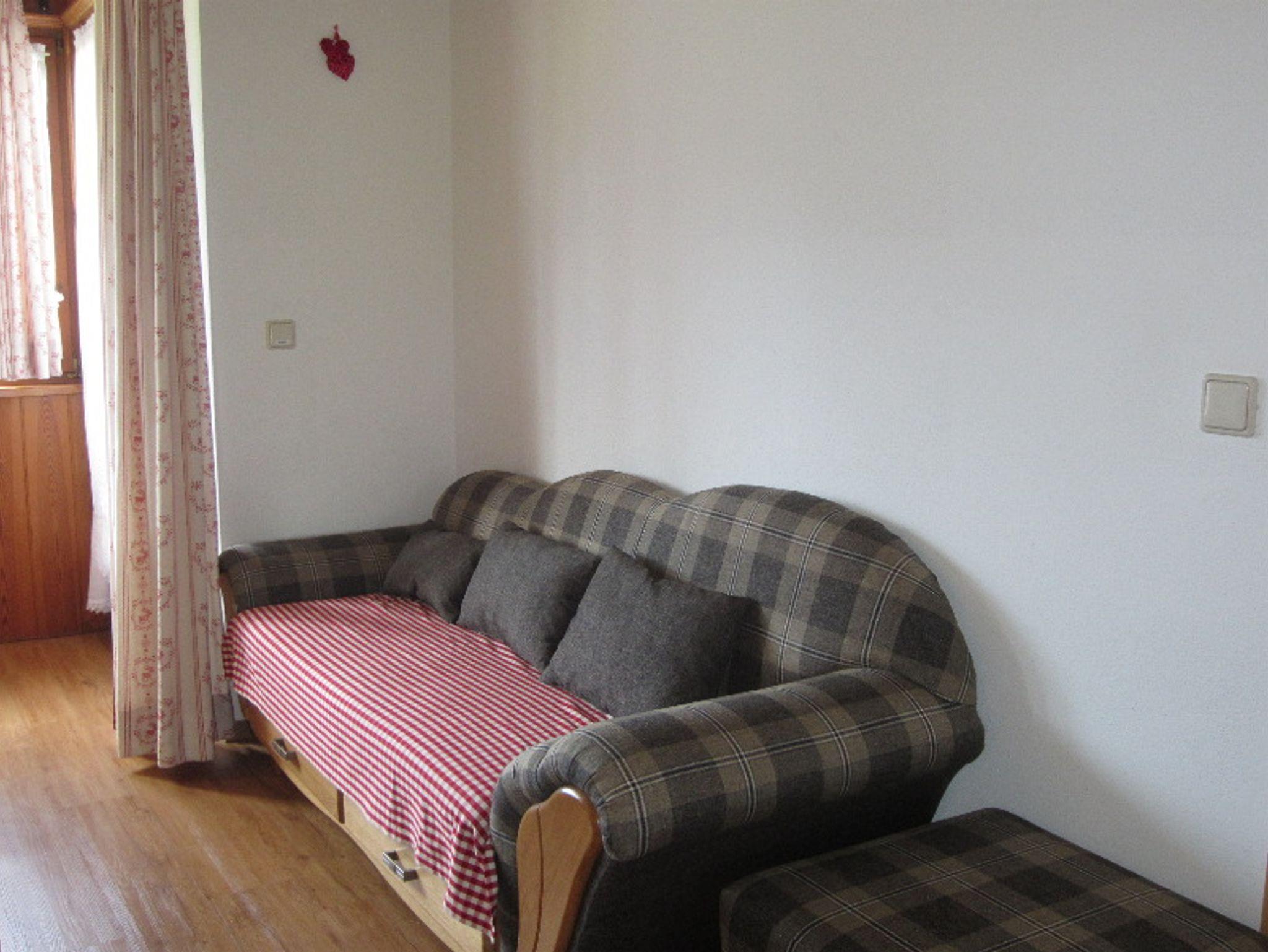 Die Ferienwohnung hat 45 qm² Wohnfläche und ist im ersten Stock des Gästehaus. Sie hat einen separaten Süd-Balkon, von dem Sie eine traumhafte Aussicht auf die Berge und ins Tal haben. Da das Haus am Hang steht, ist der Balkon vorne und an der Ostseite ist eine kleine Terrasse, auf der Sie wunderbar frühstücken können oder an heißen Tagen nachmittags im Schatten sitzen.