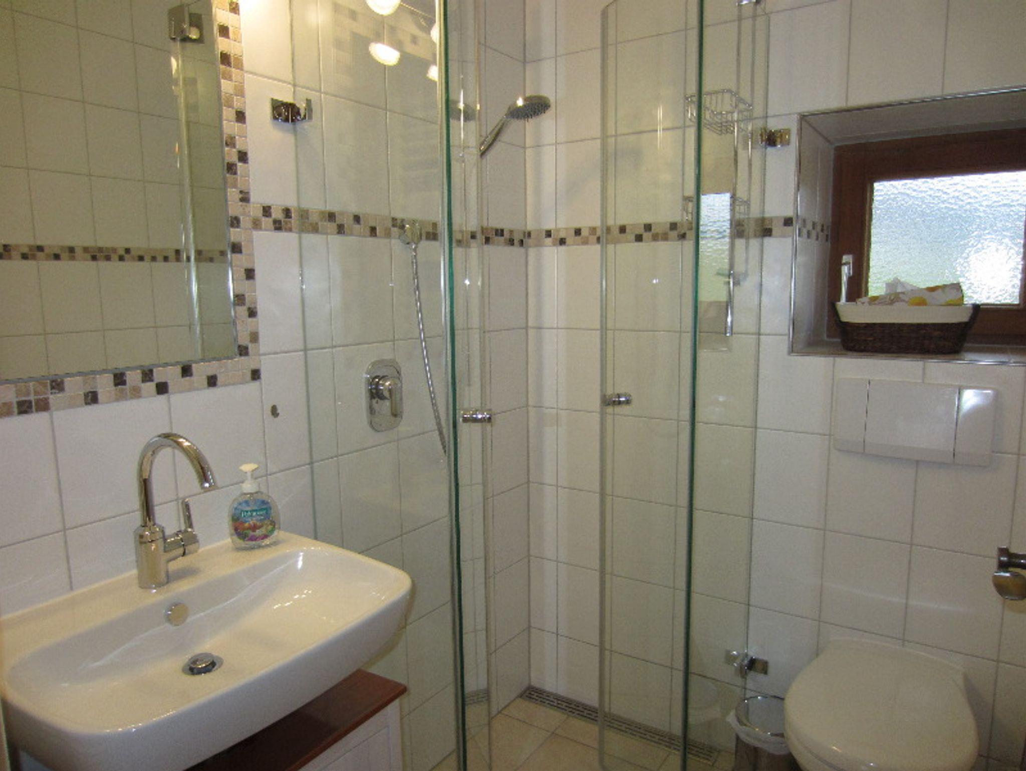 In der Wohnküche ist eine Essecke, eine Couch und die Küche mit Spülmaschine, Herd, Backofen, Mikrowelle, Kühlschrank, Kaffeemaschine, Wasserkocher, Toaster, Erstausstattung mit Spültuch, Tabs und Mülltüten. Außerdem steht hier auch der Fernseher und eine Stereoanlage. Im kleinen Bad ist eine ebenerdige Dusche, Waschbecken und WC, Handtuchtrockner, Handtücher, ein kleiner Schminkspiegel und ein Föhn. Die zwei Schlafzimmer haben einen herrlichen Ausblick auf die Berge schon beim Aufwachen.
