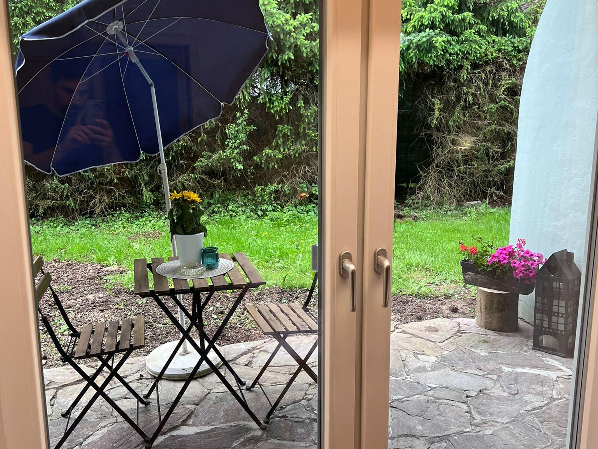 Im Garten befindet sich eine Terrasse mit Gartenmöbeln.