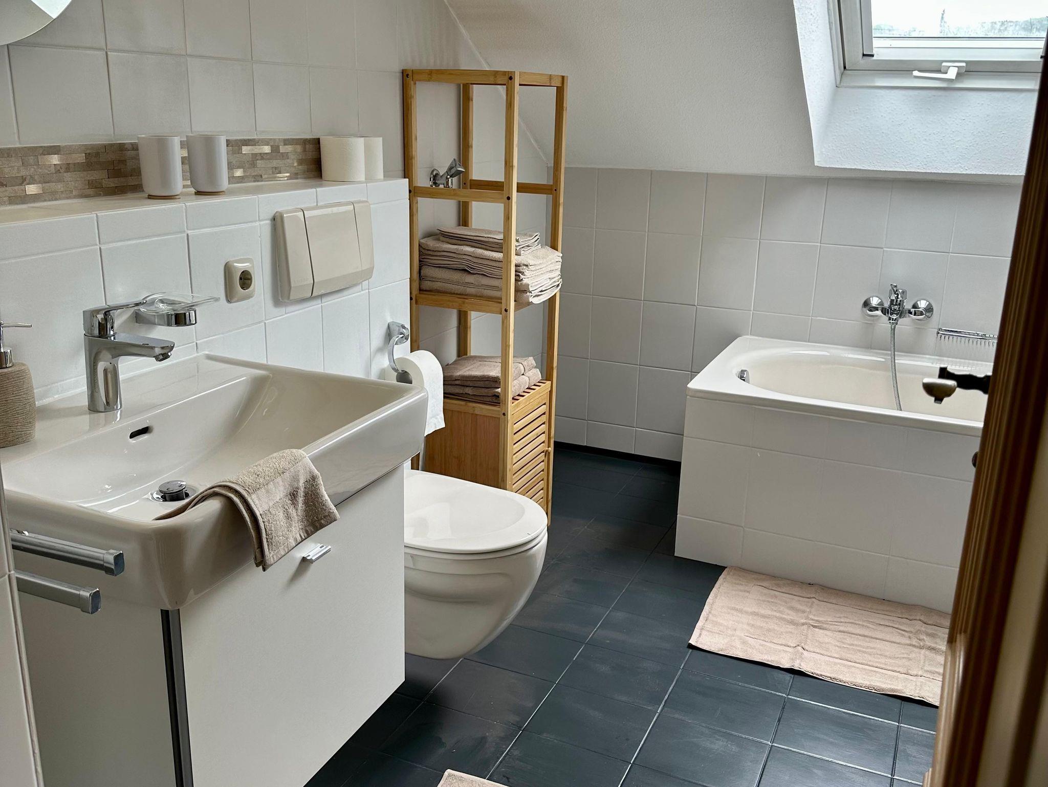Das Tageslichtbad mit Badewanne und die Küche sind modern ausgestattet, wodurch Sie sich ganz wie zu Hause fühlen können.