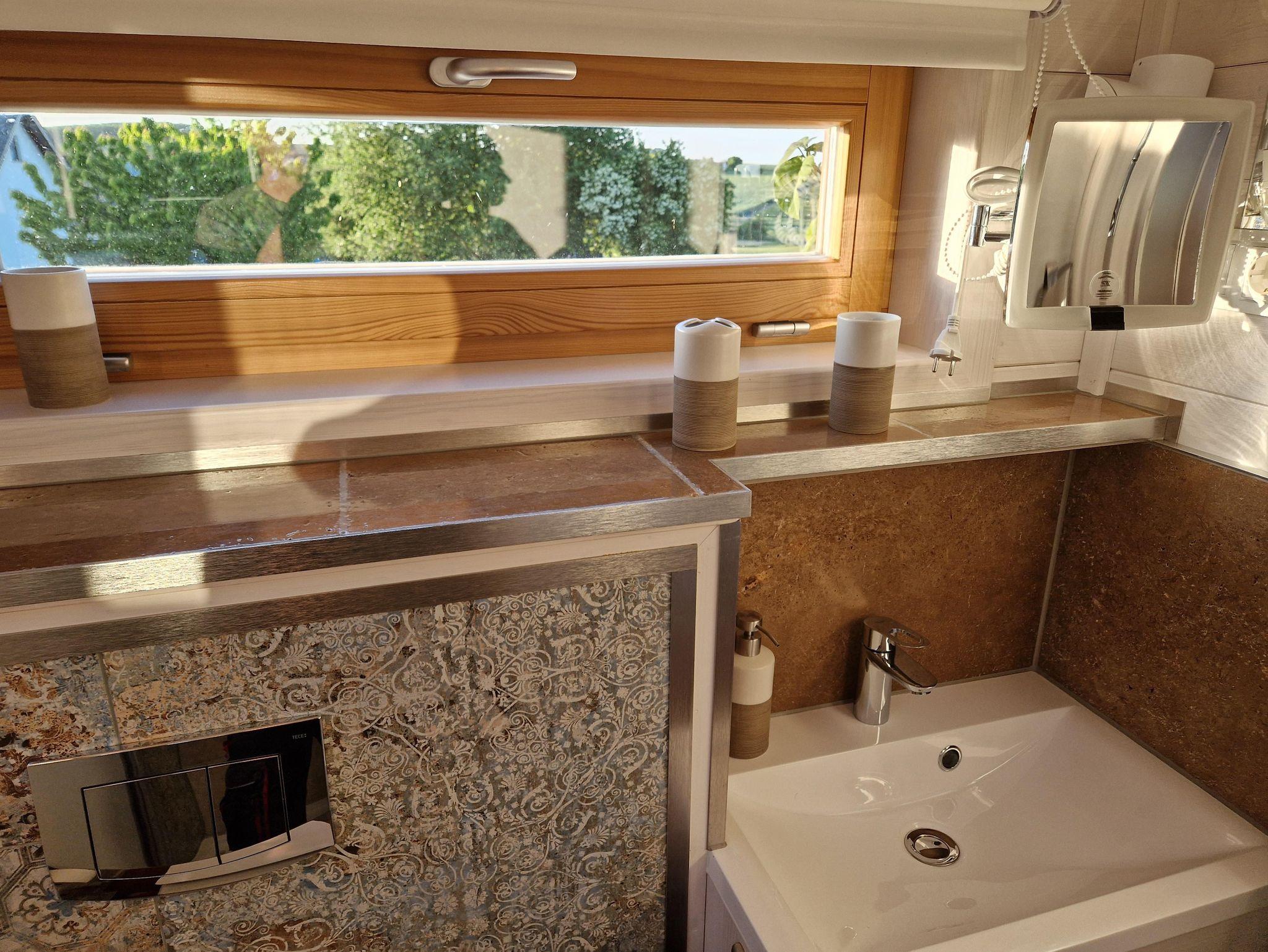 Schlafmöglichkeiten gibt es mehrere. Sowohl im gemütlichen Doppelbett in einer Nische, als auch auf dem ausklappbaren Sofa können Sie es sich mit bis zu vier Personen gemütlich machen. Der Schlafbereich mit dem Doppelbett lässt sich durch eine Schiebetür auch räumlich von dem Rest des Wagens trennen, und sorgt somit für etwas Privatsphäre.