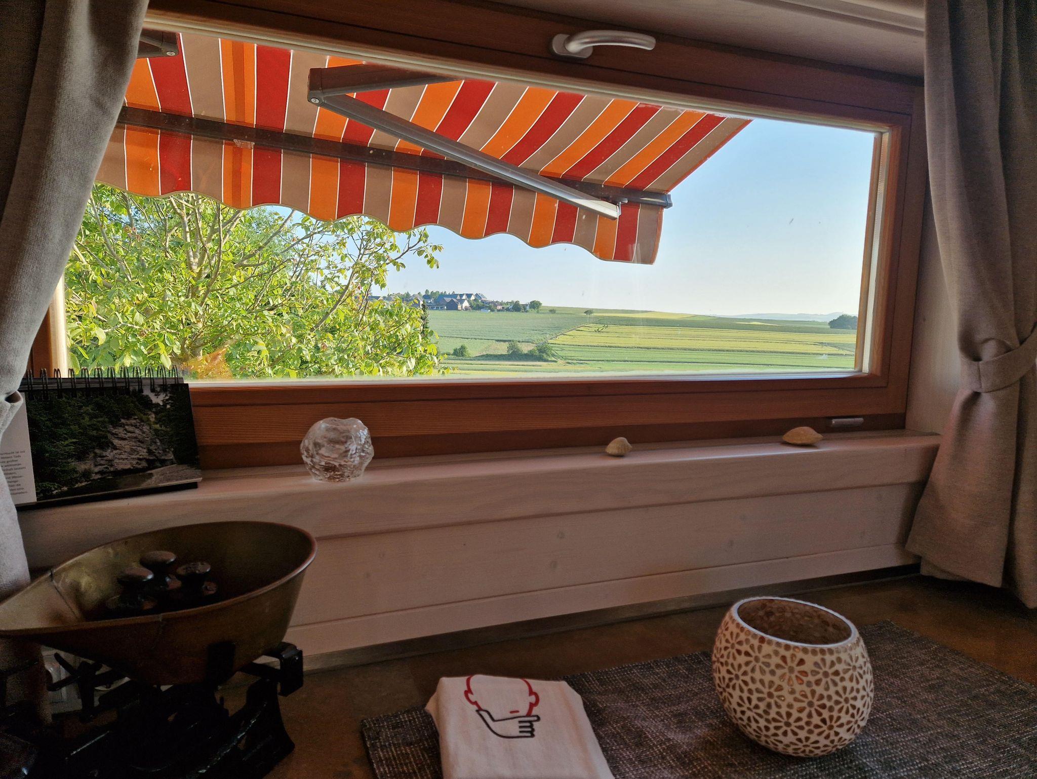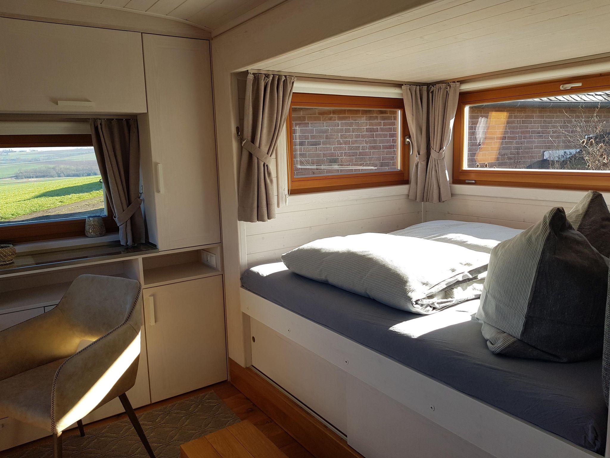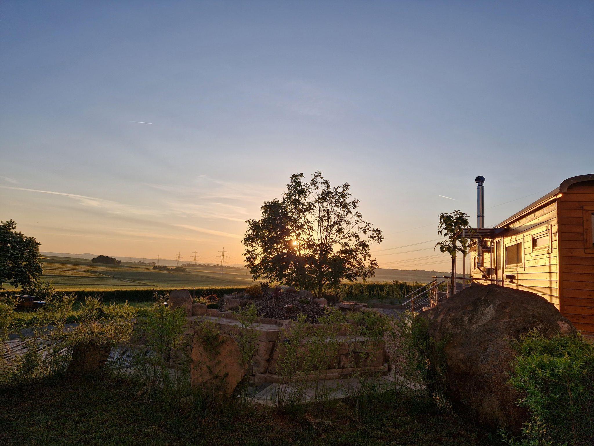 Übernachten im Tiny House Druidenstein In Ortsrandlage auf einer Anhöhe, mit Terrassenblick über die Felder des Maifelds liegt der Wohlfühlwagen. In der Mitte des Wanderweges zwischen der Burg Pyrmont und der weltberühmten Burg Eltz.