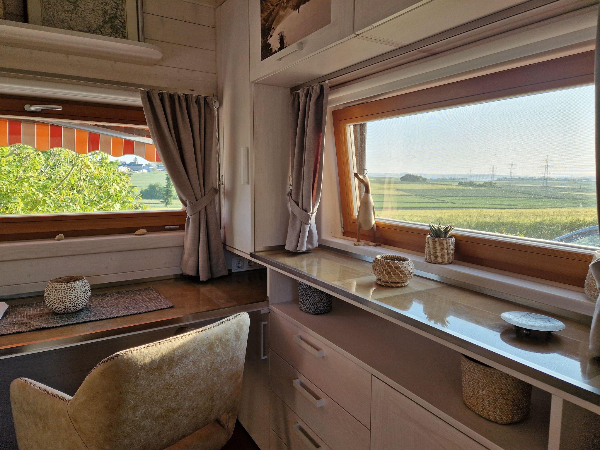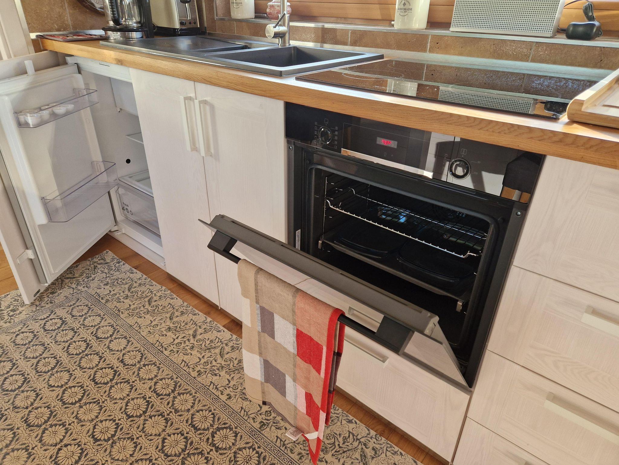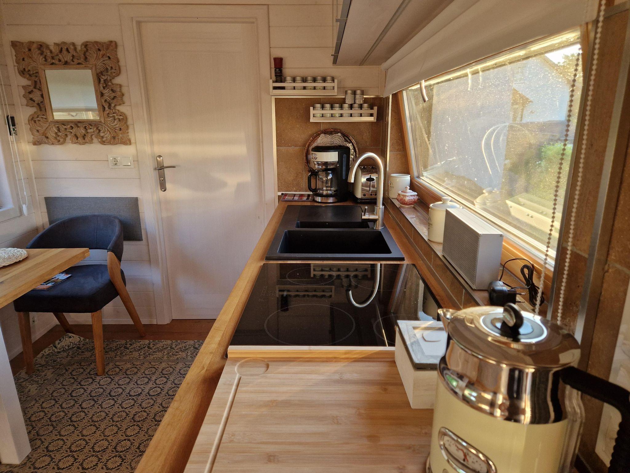 Der Wohlwagen bietet alles, was auch eine Ferienwohnung bietet. Backofen, Kochfeld, Kühlschrank, Kaffeemaschine, Wasserkocher, Geschirr, Besteck etc.