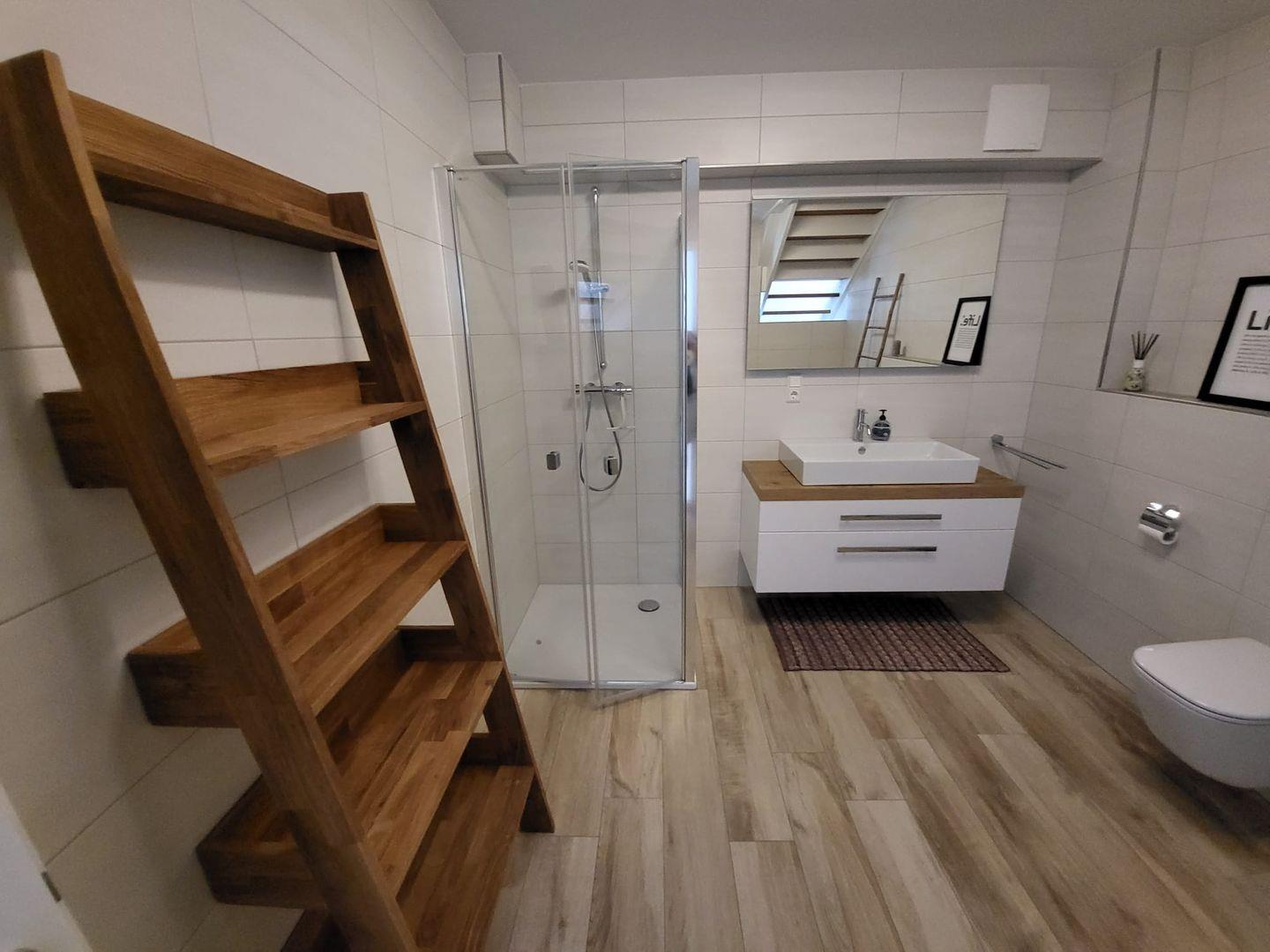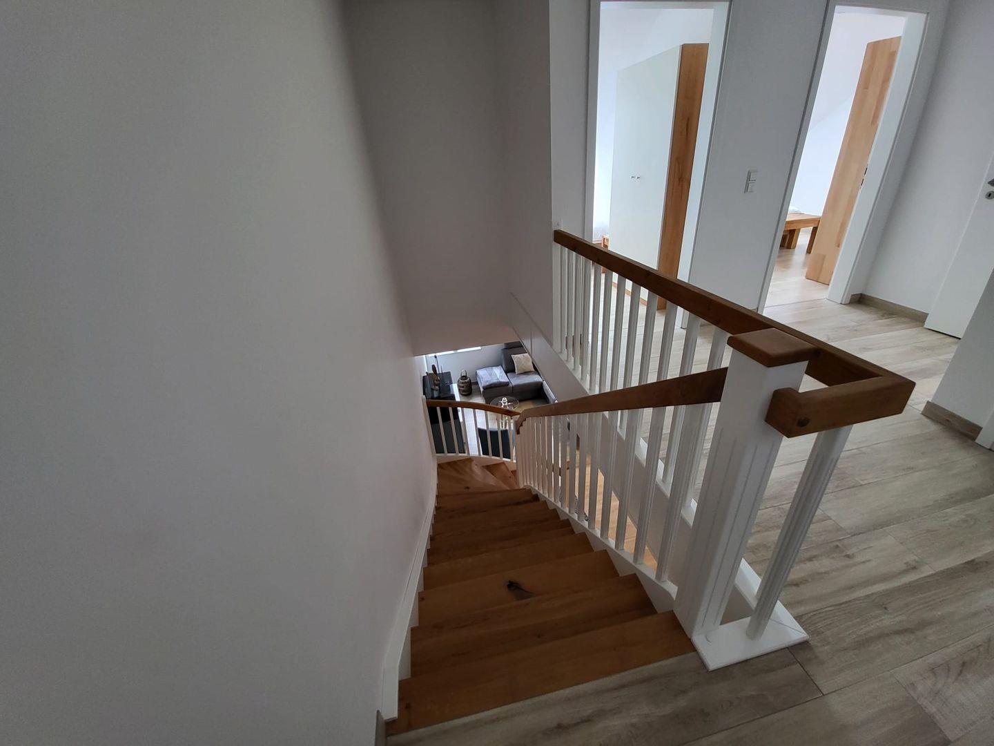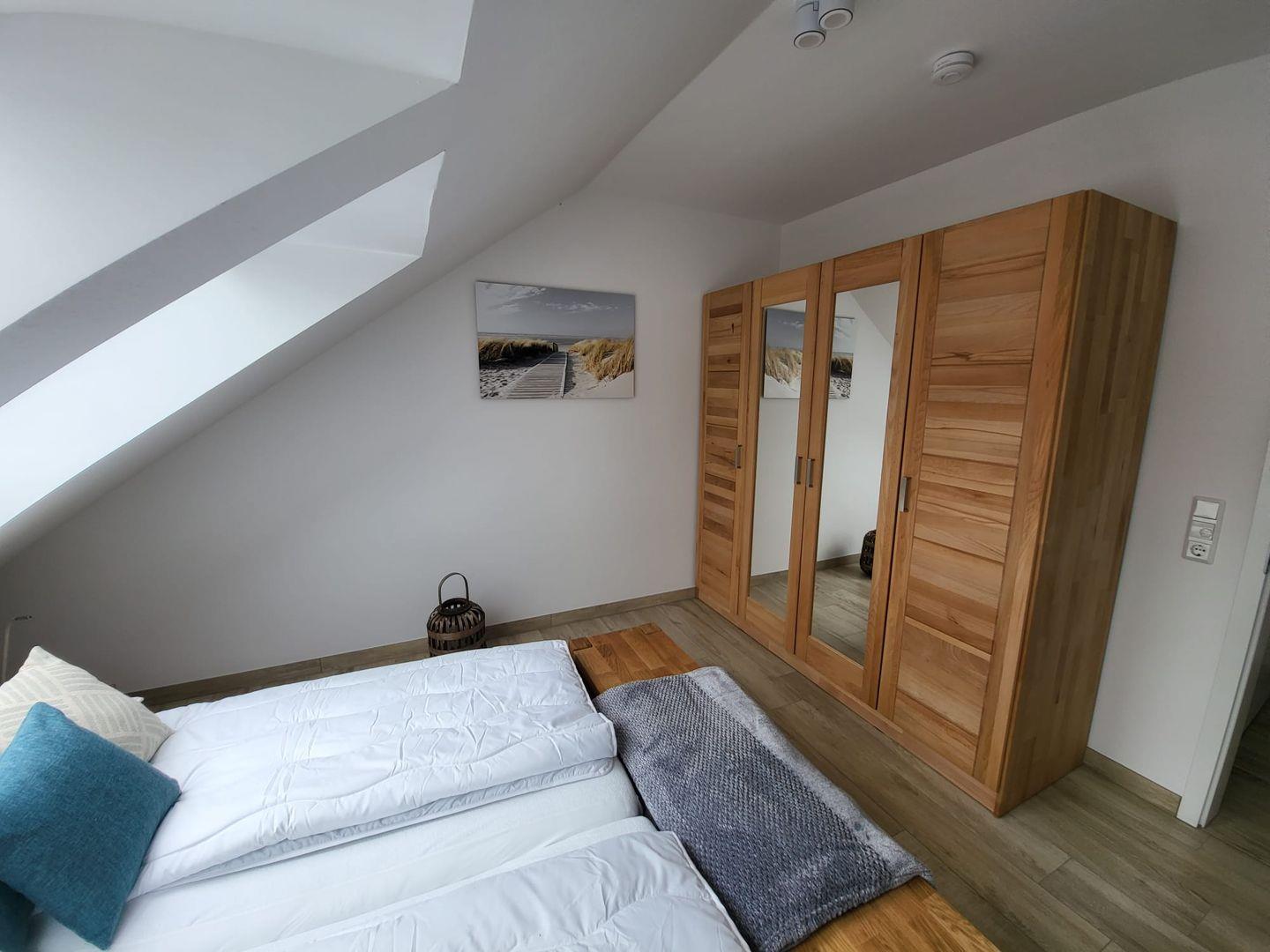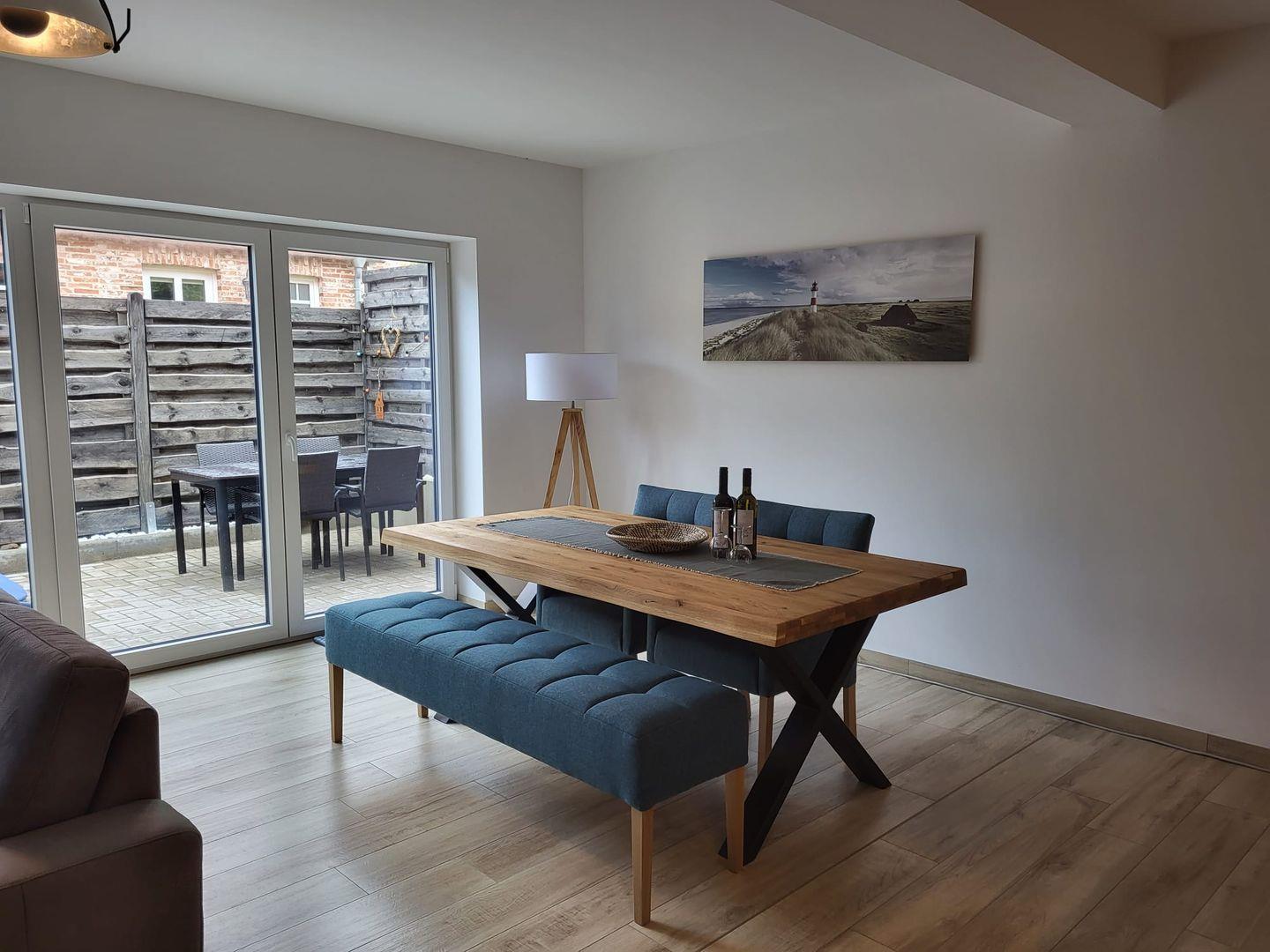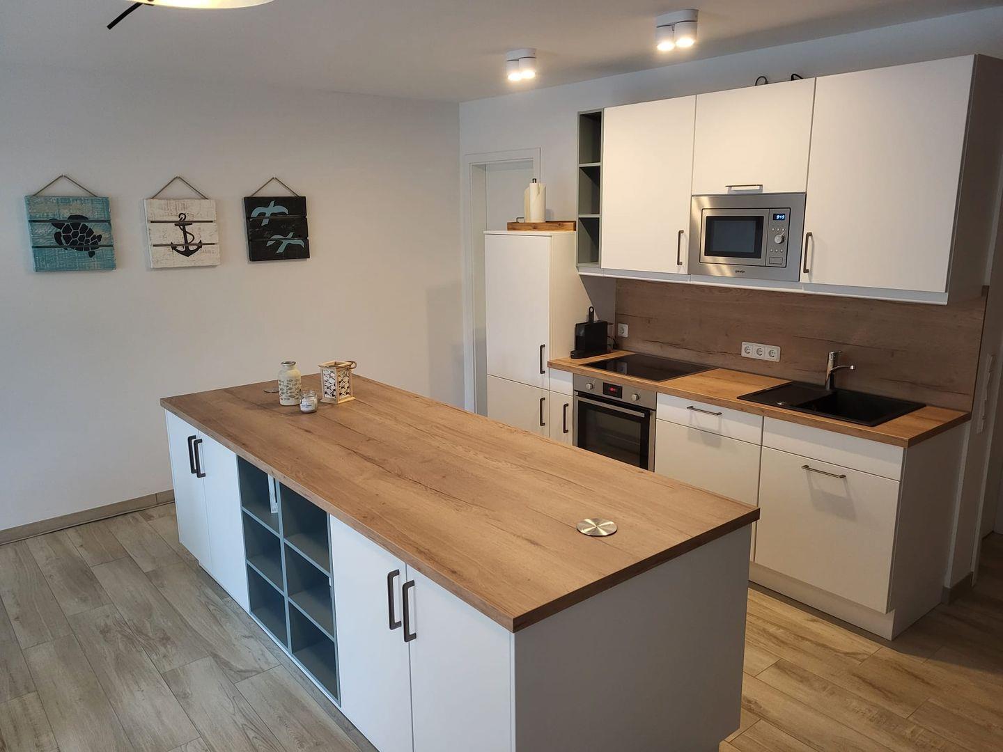 Die Ferienwohnung HyggeZEITEN wurde im Jahr 2022 fertiggestellt. Die ca. 100 m² große Wohnung erstreckt sich über 2 Ebenen und liegt am Ende des lichtdurchfluteten Hausflurs im Gulfhof Pilsum. Kommen Sie herein! Sie werden sich gleich wohlfühlen! Über einen kleinen Eingangsbereich gelangen Sie in den großen Wohn- und Essbereich mit Küche. Die große moderne Küche mit Insel lässt keine Wünsche offen. Hier leckere Speisen zuzubereiten, gelingt nicht nur dem Hobbykoch. Der Essbereich mit gemütlichen Stühlen und einer Bank lädt zu gemeinsamen Mahlzeiten oder Klön- und Spieleabende ein. Für entspannte Stunden sorgt die große Couchgarnitur und ein Flachbild-TV. Mit der individuellen Beleuchtung entfaltet sich ein wohliges Ambiente. Die große Fensterfront verleiht dem Raum ebenso viel Tageslicht. Von hier gelangen Sie auf die Terrasse, wo Sie nach einer langen Fahrradtour oder Spaziergang relaxen können. Ein Gäste WC und ein Abstellraum mit Waschmaschine und Trockner befinden sich ebenfalls im EG. Über eine Holztreppe gelangen Sie in die erste Etage, wo Sie das große helle Bad mit ebenerdiger Dusche finden. Nebenan laden 2 kuschelige Schlafzimmer (eines mit Doppelbett und eines mit 2 Einzelbetten) zum Träumen und Ausruhen ein. Beide Schlafzimmer können elektrisch verdunkelt werden. In einem Zimmer gibt es ein LED-TV und eine Musikanlage. Das Dachgeschoß wird ausschließlich privat genutzt. WLAN ist verfügbar. Zur Wohnung gehört ein Parkplatz. An einer Wallbox kann Ihr E-Auto geladen werden. Falls Sie Ihr Fahrzeug aufladen möchten, wird hier eine Gebühr von 5,00 € je Nacht erhoben. Zudem gibt es eine Fahrradbox, wo bis zu 4 (mitgebrachte) Fahrräder Platz finden. Ebenfalls können Ihre E-Bikes dort kostenlos aufgeladen werden.
