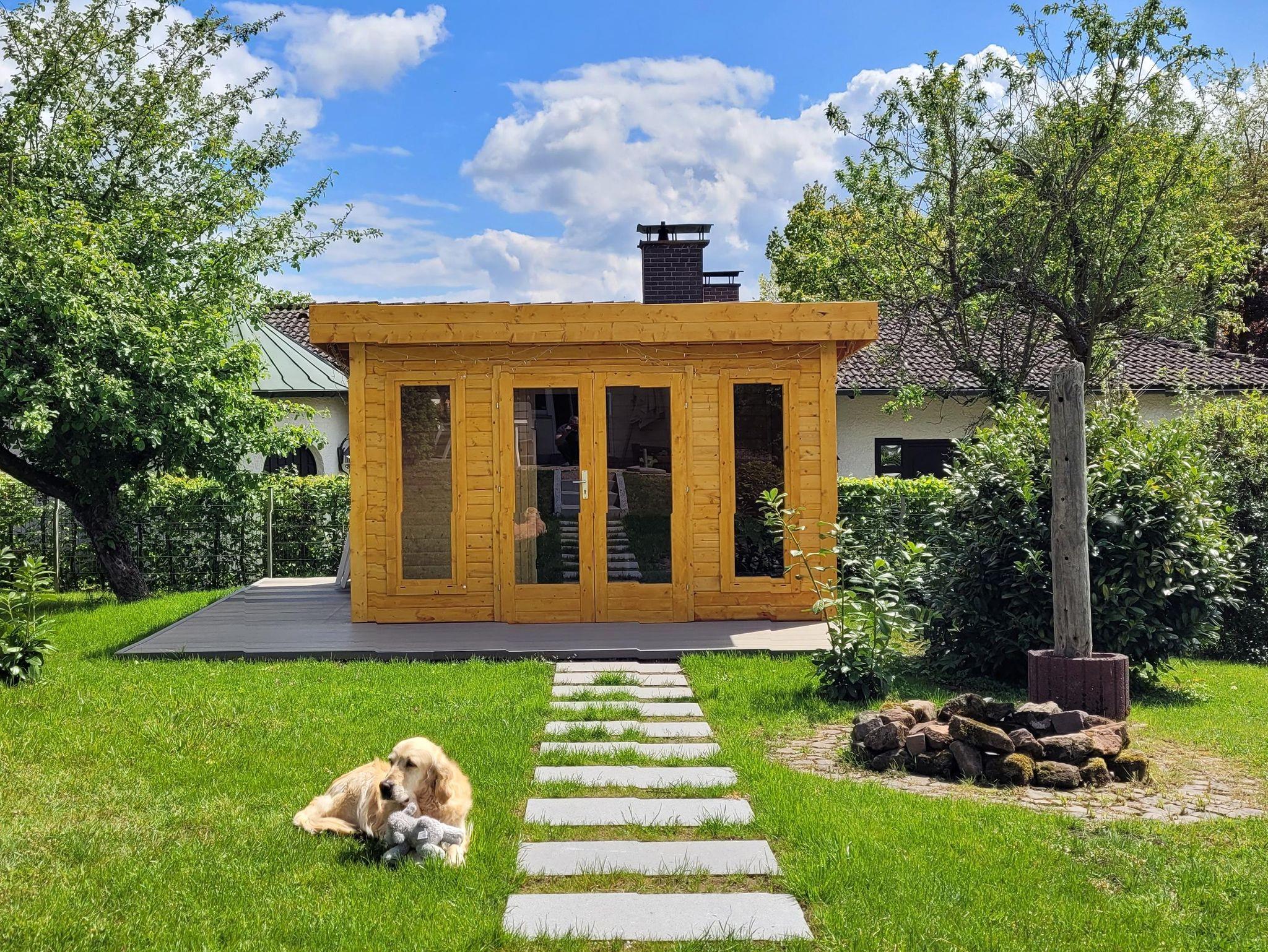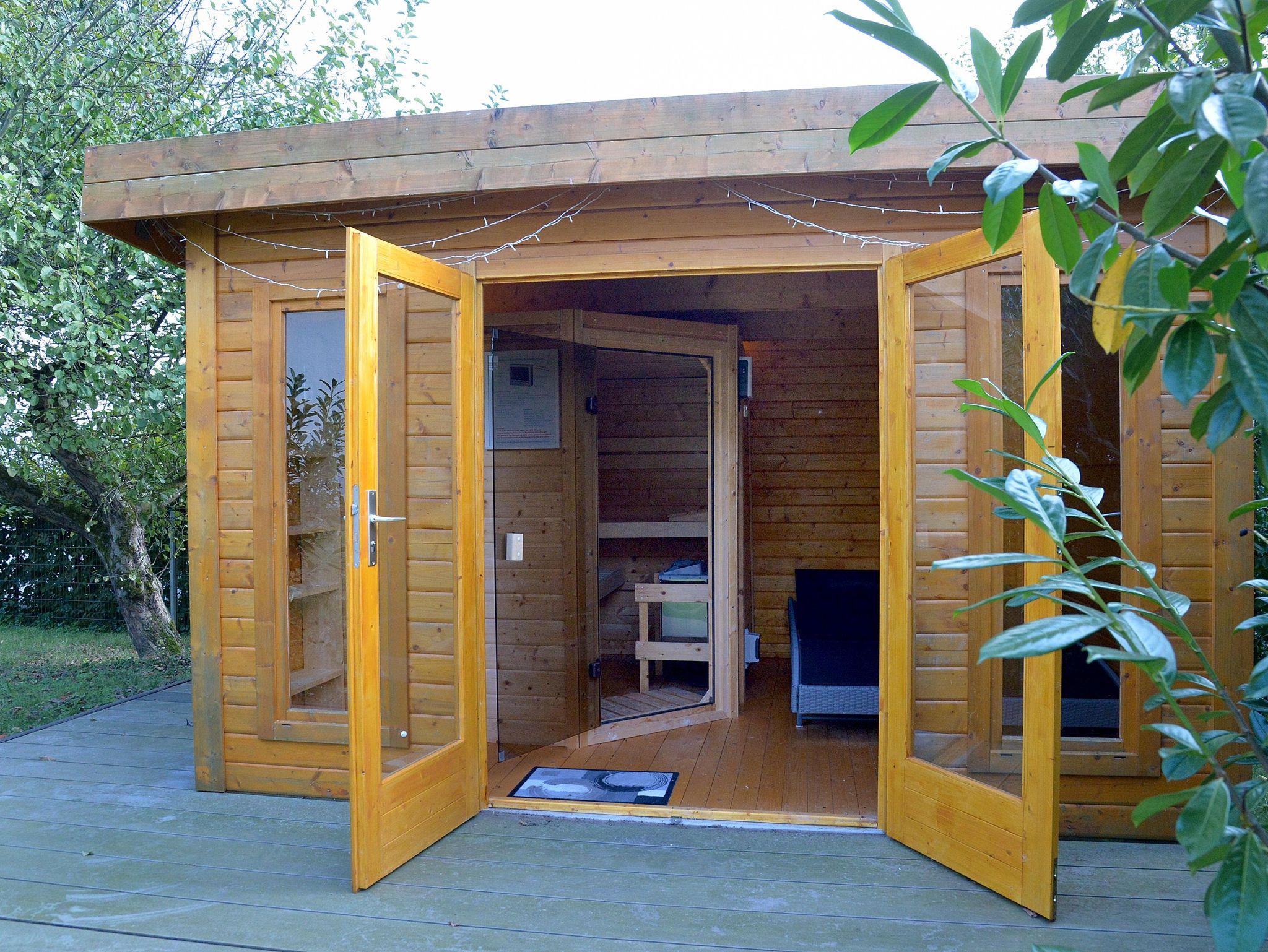 Unsere moderne Blockbohlensauna im Garten kann optional zugebucht werden und bietet Bio- und finnische Betriebsart.