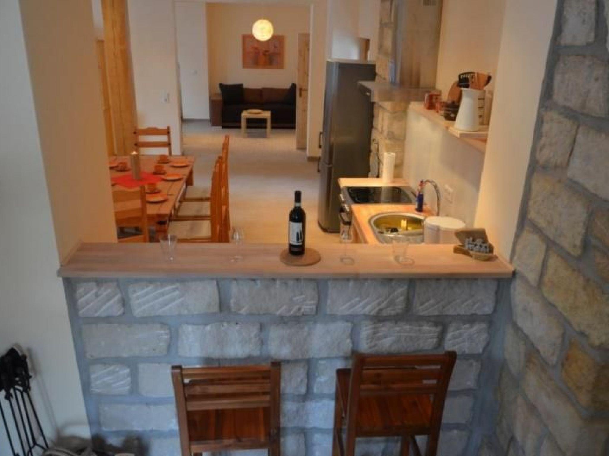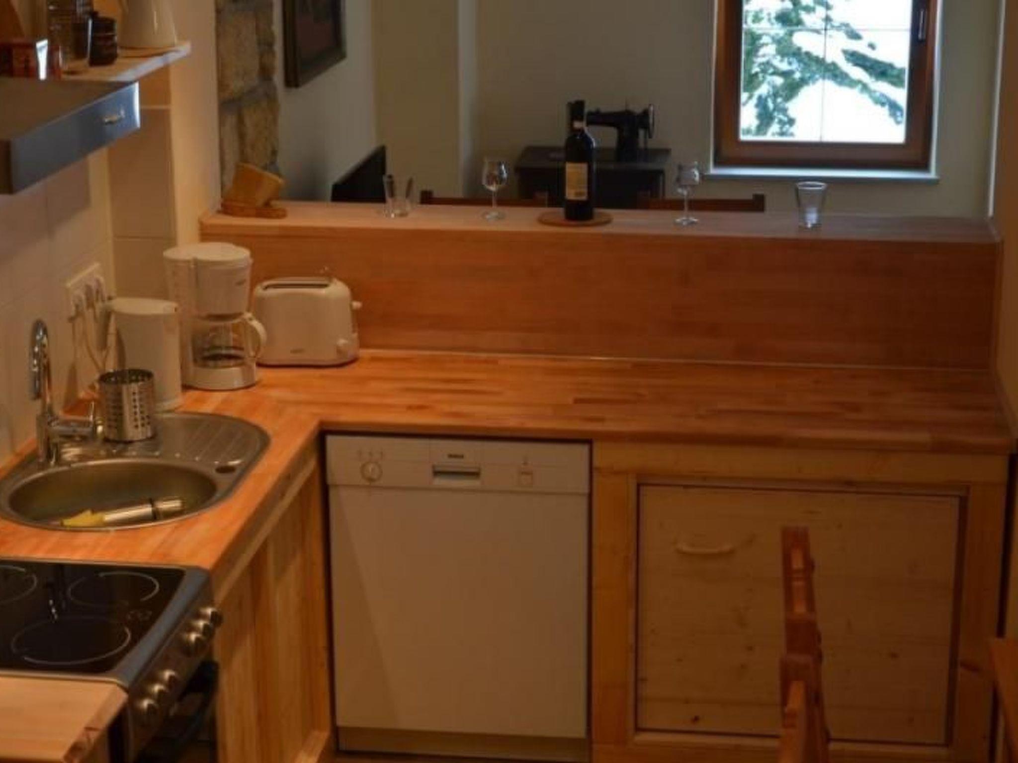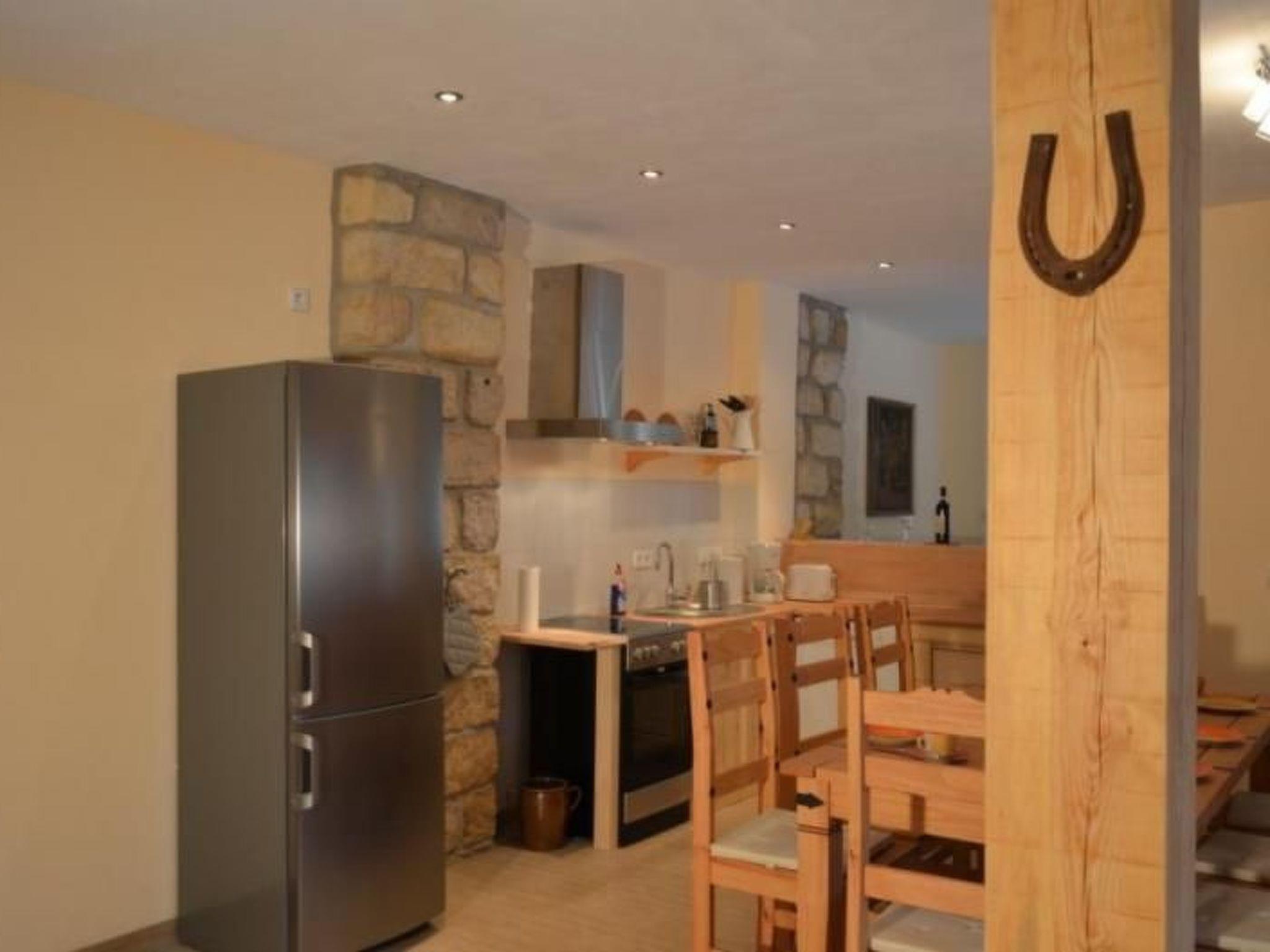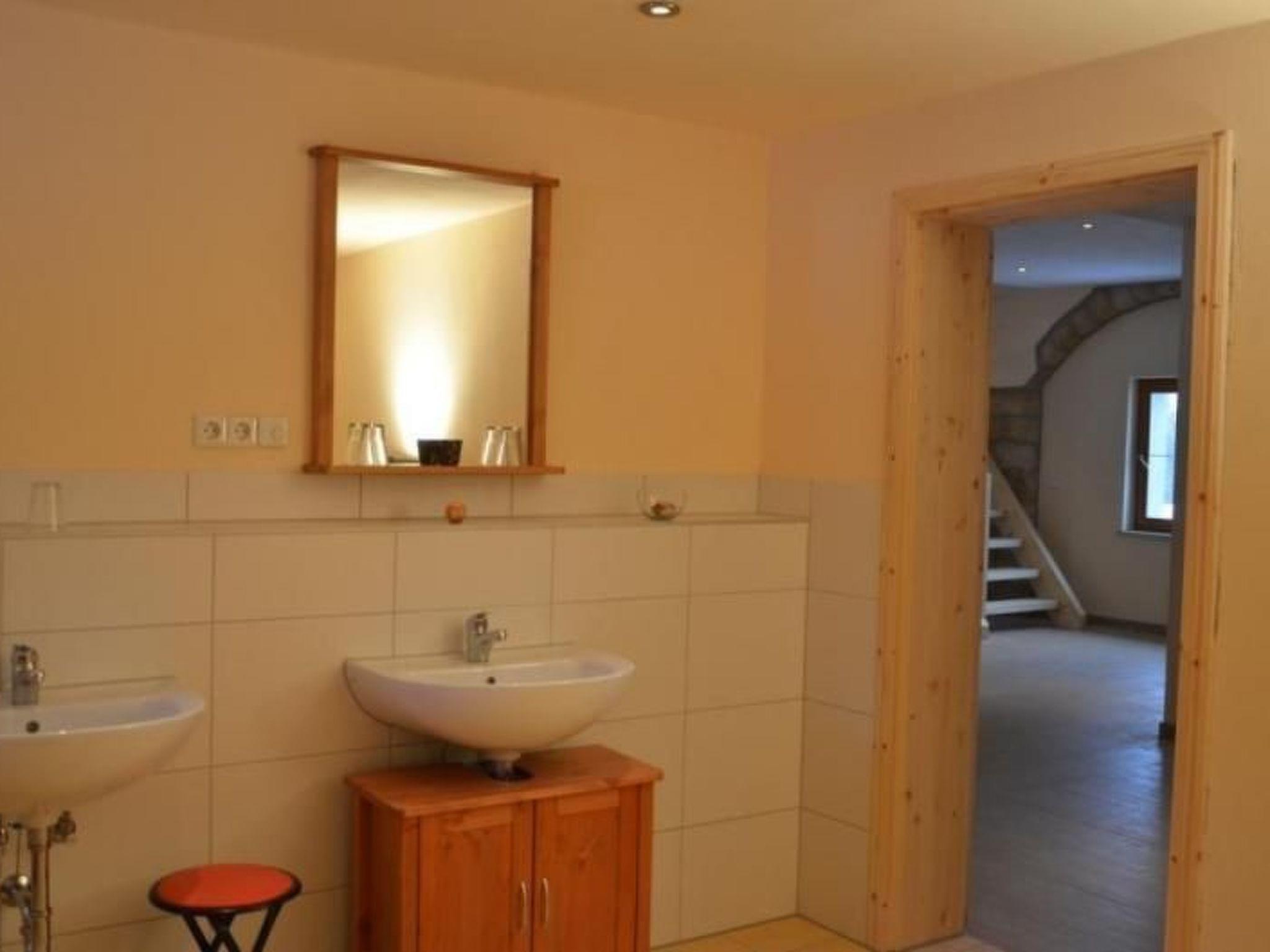 The holiday home at the Bärenstein for two to eight people has been lovingly renovated with a total living space of more than 140 m². On the ground floor there is a large entrance area with a sitting area, a large bathroom with two showers, two washbasins and WC, as well as a 55 m² living room with kitchen, wood-burning stove, large dining table, a bar and a cosy sofa corner. The kitchen is also equipped with a 4-burner ceramic hob with oven, large fridge with freezer compartment and dishwasher. The living room has a TV, DVD player, radio and CD player as well as a DSL 6000 wifi internet connection and a wood-burning stove. The entire house has central heating. The lower part of the house is also equipped with underfloor heating. The central heating is included. Firewood at purchase price. On the top floor there are two 2-bed rooms, one 4-bed room and a toilet. There are a total of three bedrooms available.
