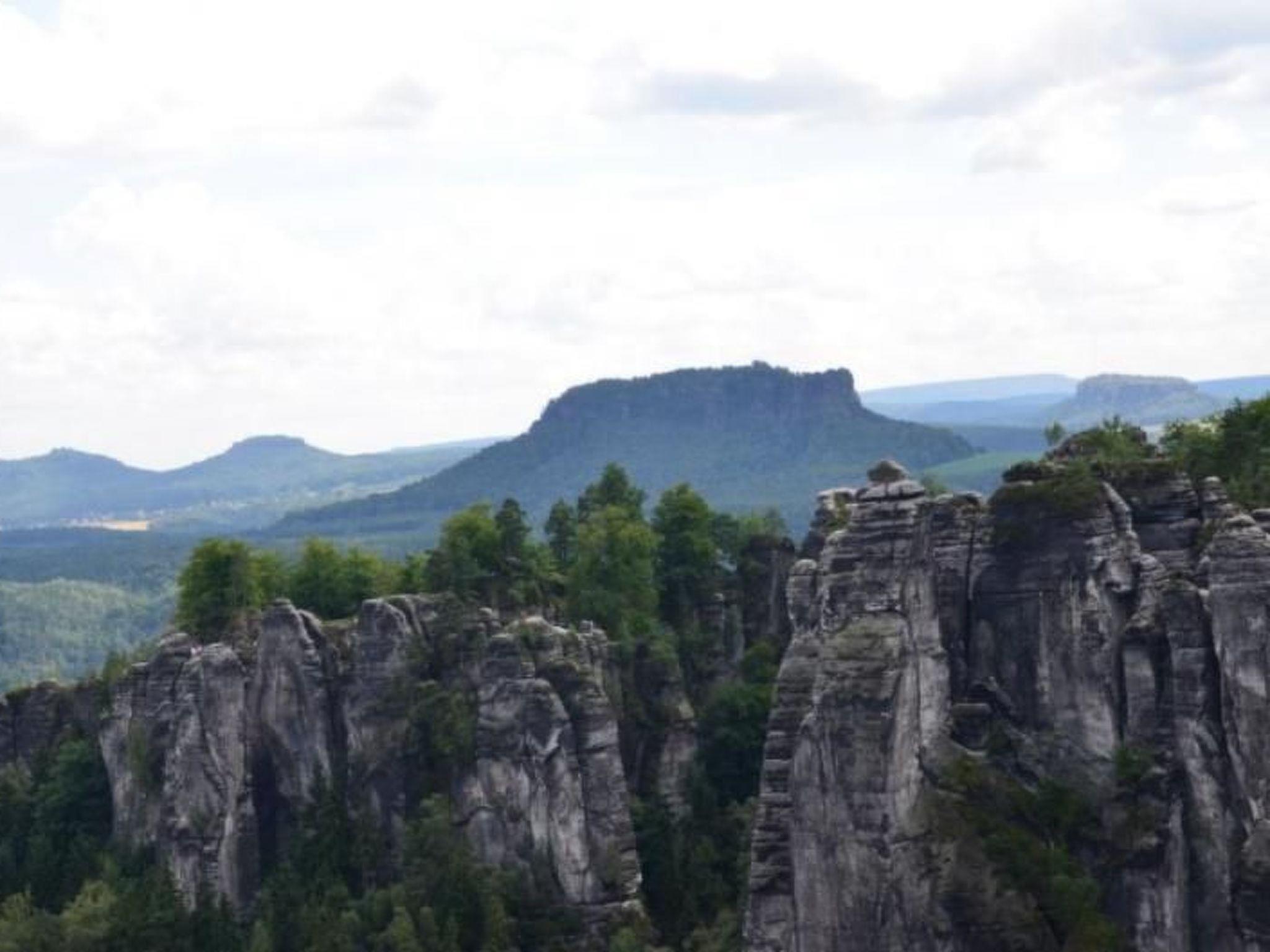 The most striking table mountain in Saxon Switzerland, located near Königstein and Waltersdorf, rises 300 metres above the Elbe valley and offers fantastic views. Ascent via the 110-metre-high foot slope and a 70-metre-high set of steps to a heavily disintegrated summit plateau, which reveals the remains of a 14th century castle complex. The Lilienstein is a control point for the "Eisenach-Budapest International Mountain Hiking Trail".