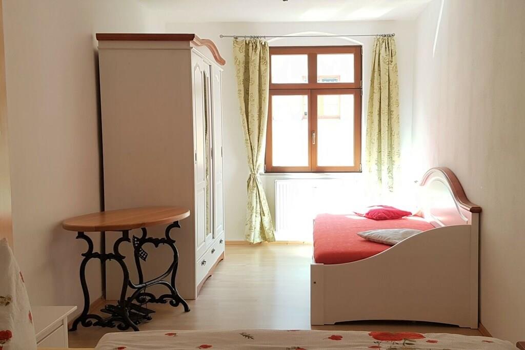 Sie bewohnen das zweite Obergeschoss eines historischen Hauses in Pirnas Altstadt. Die Ferienwohnung ist 74m² groß, vollständig ausgestattet mit zeitgemäßem Komfort für Ihre Ansprüche eines genussvollen Urlaubs in der Sächsischen Schweiz. Vom Wohn- und Schlafzimmerfenster aus sehen Sie das Schloss Sonnenstein. Vom Balkon haben Sie einen Blick auf die Elbe. In der voll ausgestatteten Einbauküche bereiten Sie Ihr Frühstück zu und nehmen zu viert am Küchentisch Platz. Entspannen Sie auf dem gemütlichen Sofa und Sessel, legen die Beine auf den Hocker, bei Entertainment via digitalem Sat-TV sowie Stereoanlage. Ein großzügiges Doppelbett und ein Einzelbett stehen im Schlafzimmer sowie ein zum Doppelbett ausziehbares Einzelbett im 2. Schlafzimmer, so dass 5 Personen bequem übernachten können.