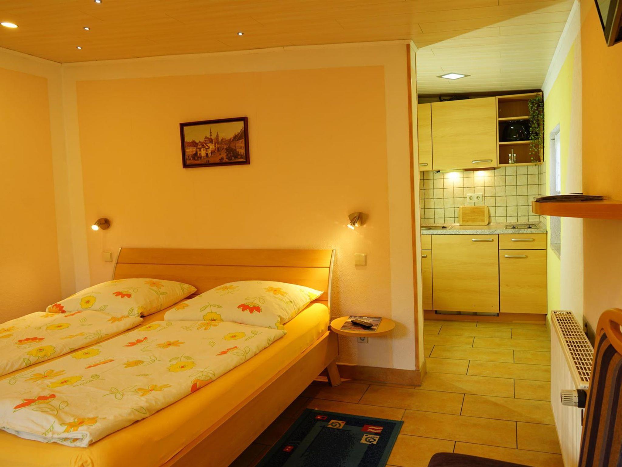 Das ca. 23m² große Doppelzimmer mit kombiniertem Wohn-/ Schlafraum (Doppelbett + Sitzgruppe) ist mit einer kleinen Miniküche sowie einem Bad ausgestattet. Das Bad ist mit Dusche & WC & WT sowie ausreichend Ablagen versehen.