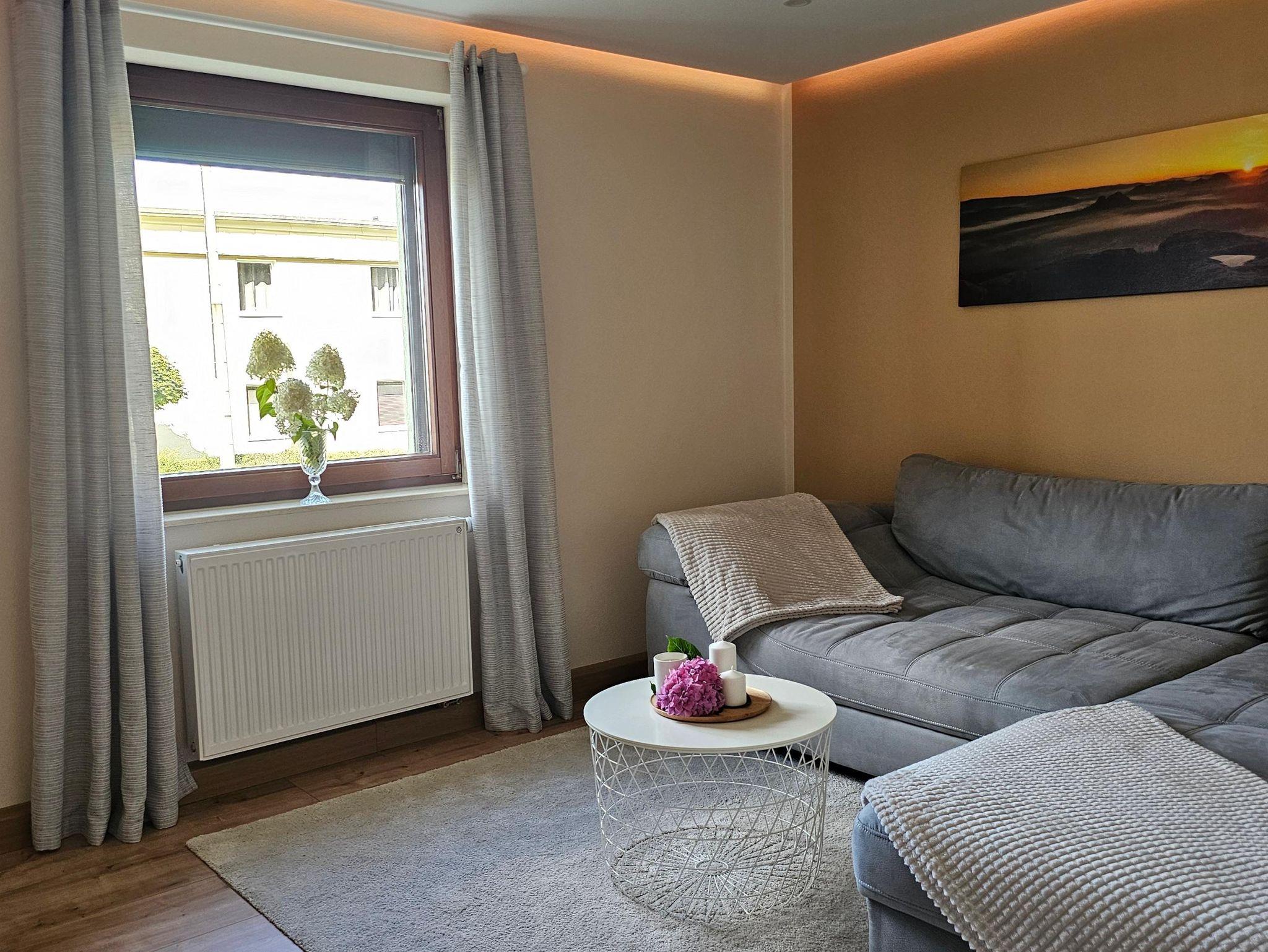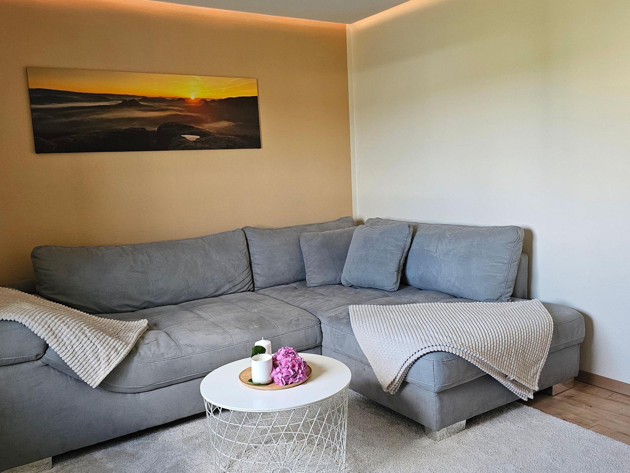 Die Ferienwohnung verfügt über eine gemütliche Wohnküche mit Sitzecke, zwei Schlafräume, in einem befindet sich ein Doppelbett, während im kleineren Zimmer ein ausziehbares Bett für zwei Personen bereitsteht. Im Wohnraum laden ein großzügiges Ecksofa und ein Fernseher mit Sat-Empfang zum Entspannen ein.