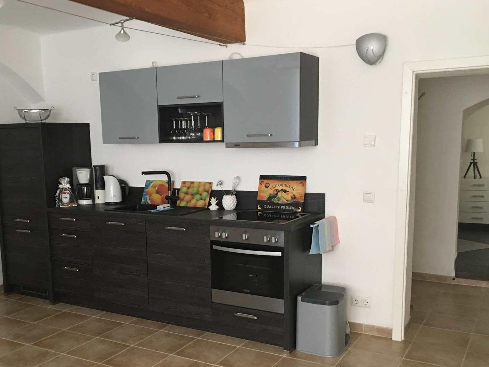 Die Küche ist voll ausgestattet und der offene Wohnraum verfügt über Fußbodenheizung.