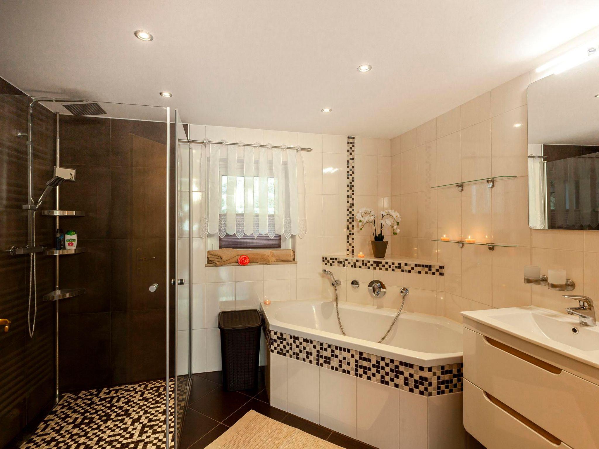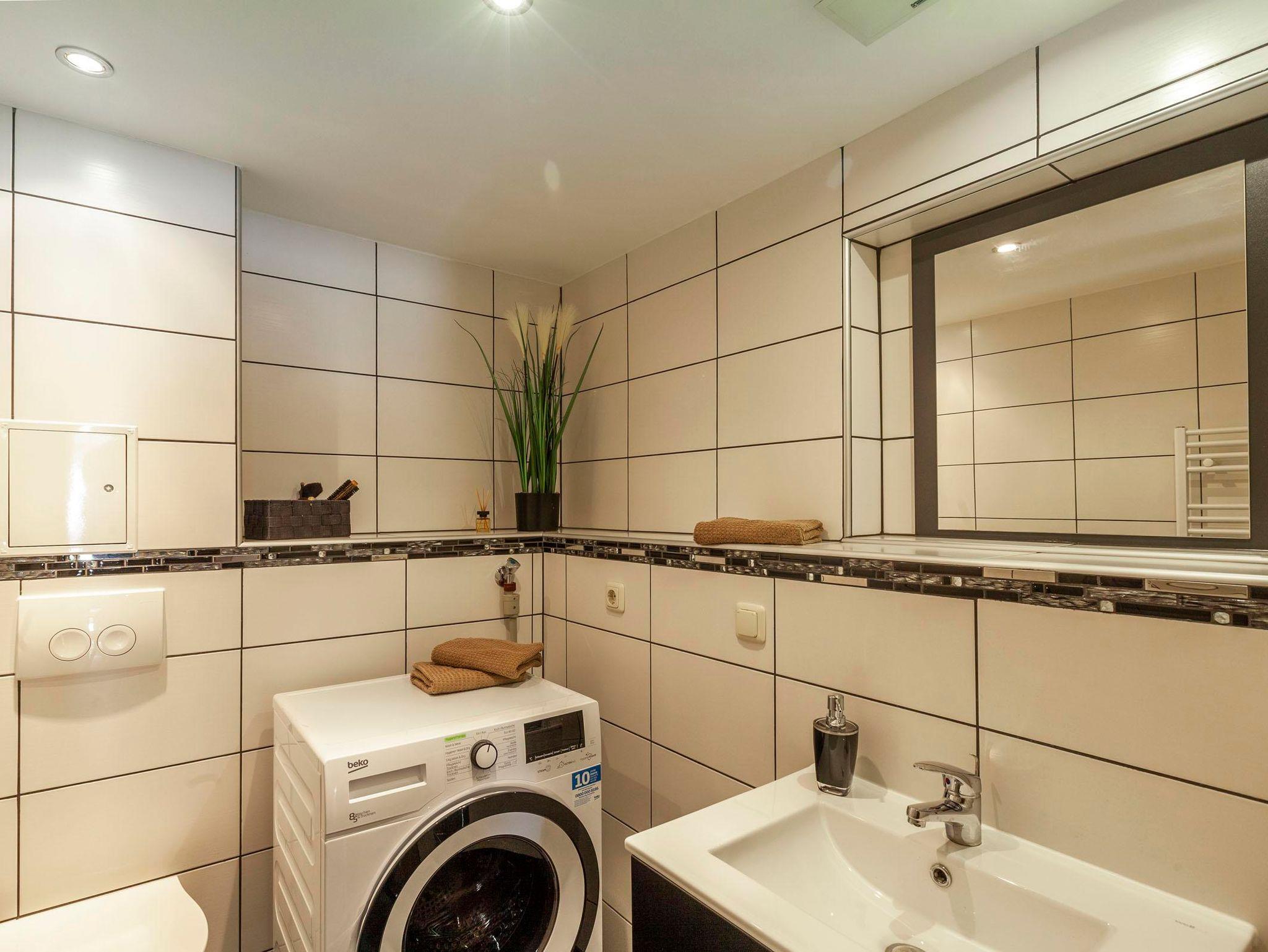 Das Badezimmer ist mit einer Badewanne, Dusche und WC eingereichtet. Ein separates WC mit Waschmaschine steht ebenfalls zur Verfügung.