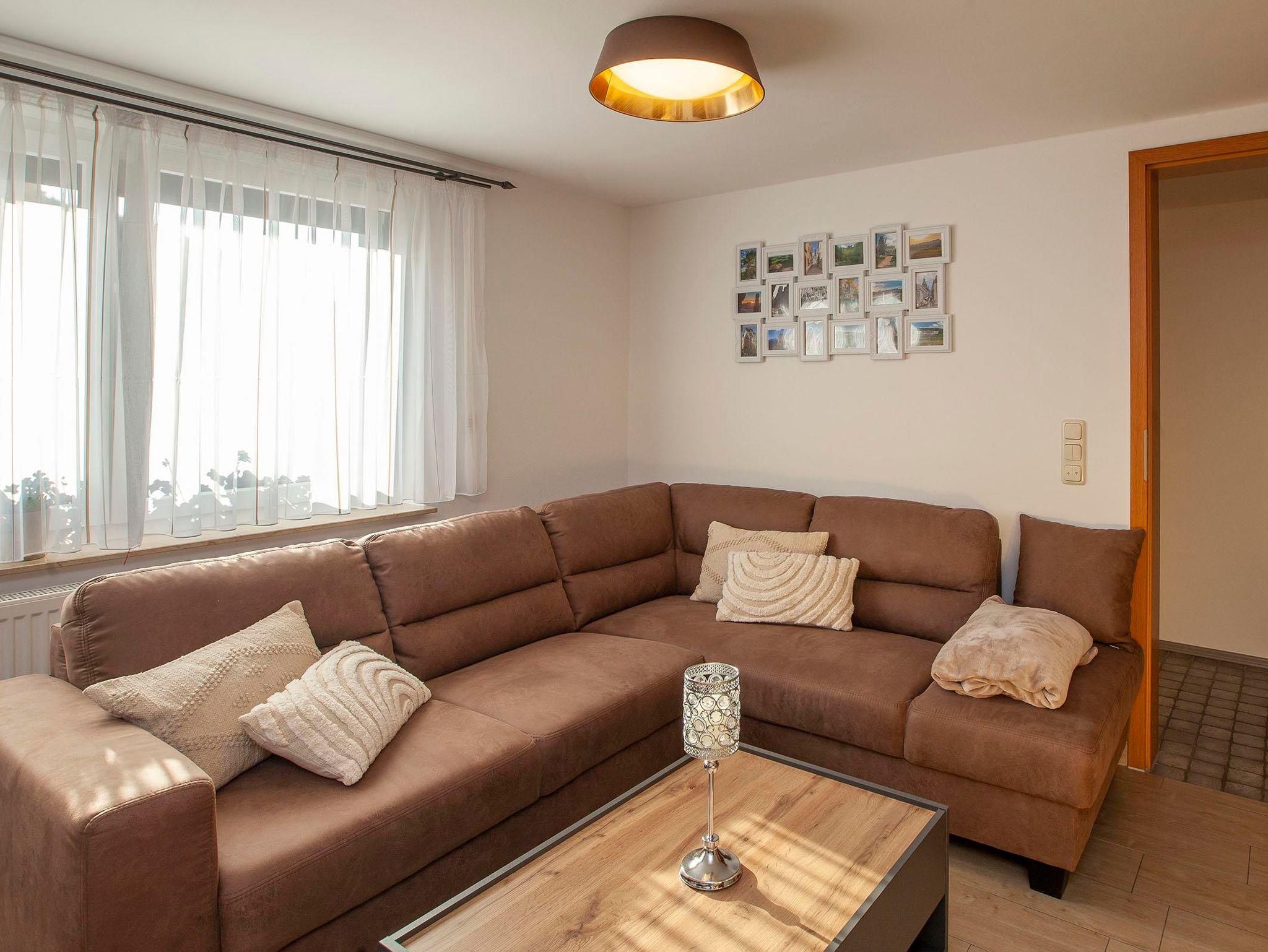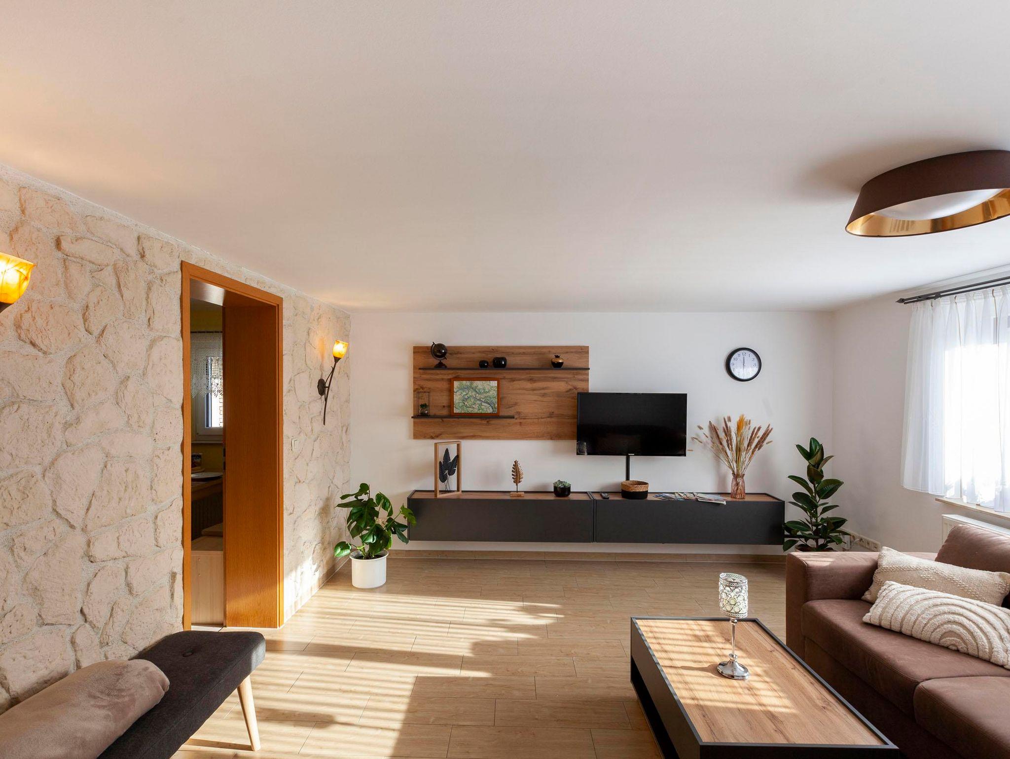 Das helle und geräumig Wohnzimmer bietet genügend Platz für gesellige Abende in Familie. Auf der Couch mit Doppelbettfunktion können bequem zwei Personen übernachten. TV und Highspeed Internet gehört zur Ausstattung.