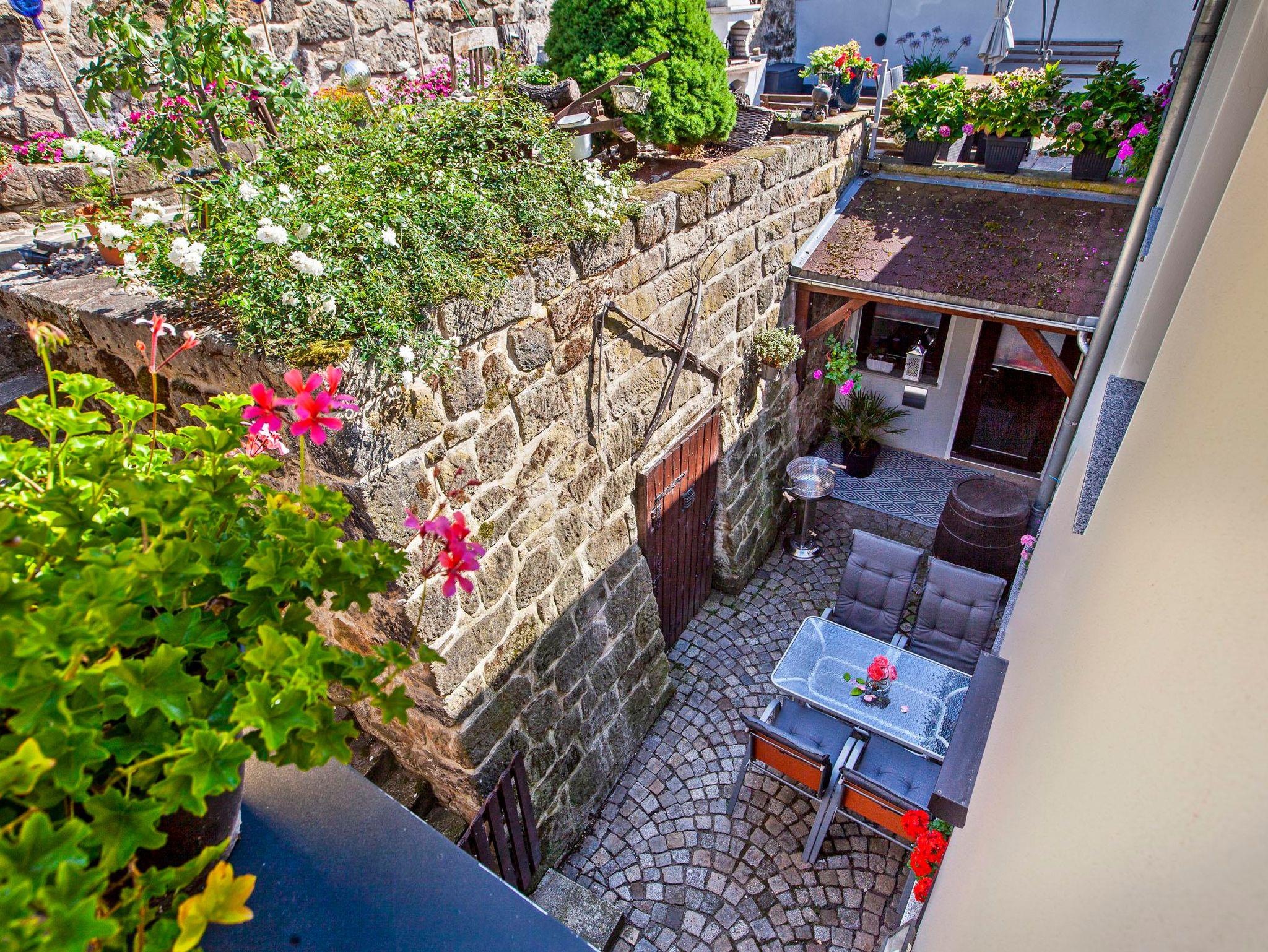 Im Hof gibt es einige schattige Plätze, die zum Verweilen an heißen Sommertagen einladen. Die Terrasse befindet sich im Halbschatten.