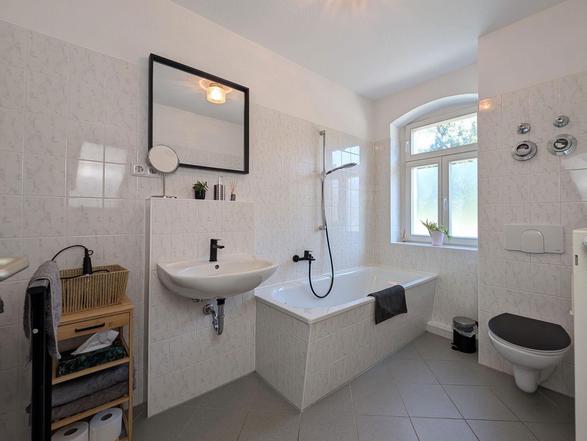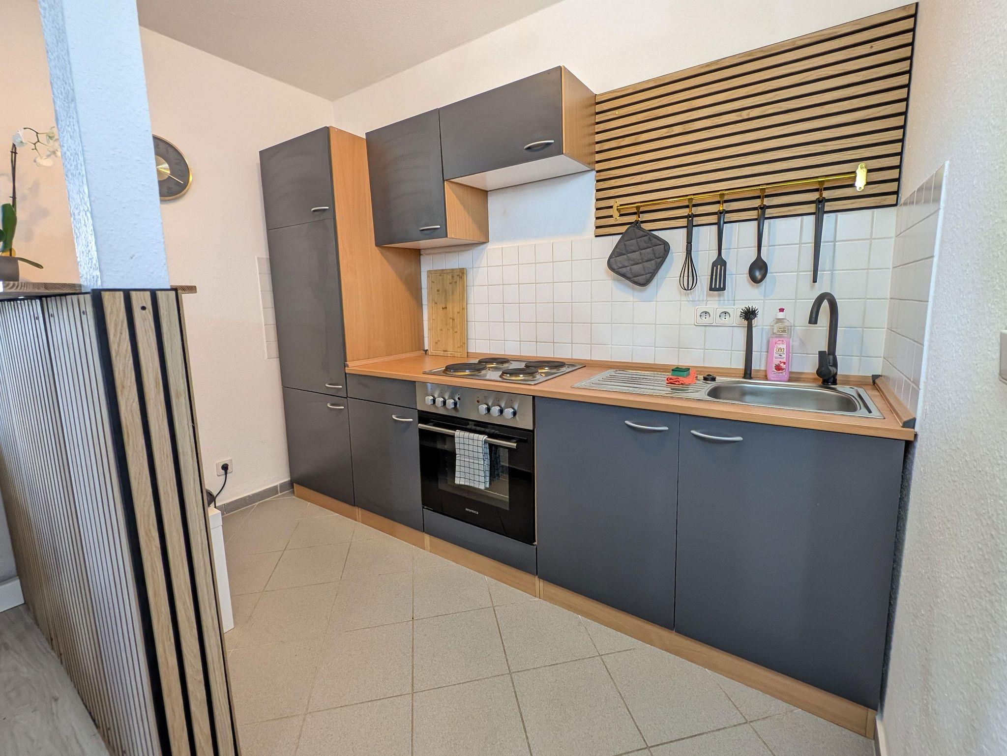 Die Küche besteht aus einer komfortablen Einbauküche mit kompletter Küchenausstattung, Kaffeemaschine, Toaster und Wasserkocher sind vorhanden. Das moderne und helle Bad ist mit Badmöbeln inklusive Waschplatz, einer Badewanne mit Dusche und WC ausgestattet.