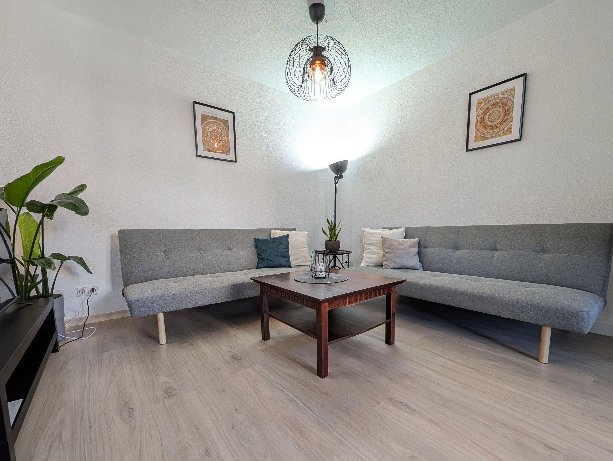 Die Ferienwohnung II liegt im Erdgeschoss und verfügt über einen eigenen Balkon und einen separaten Schlafraum mit Boxspringbett (140 x 200 cm). Der Wohnraum ist neu und modern ausgestattet mit einer Schlafcouch (Aufbettungsmöglichkeit für die 3. Person), einer offenen Küche und einem separaten Essplatz.