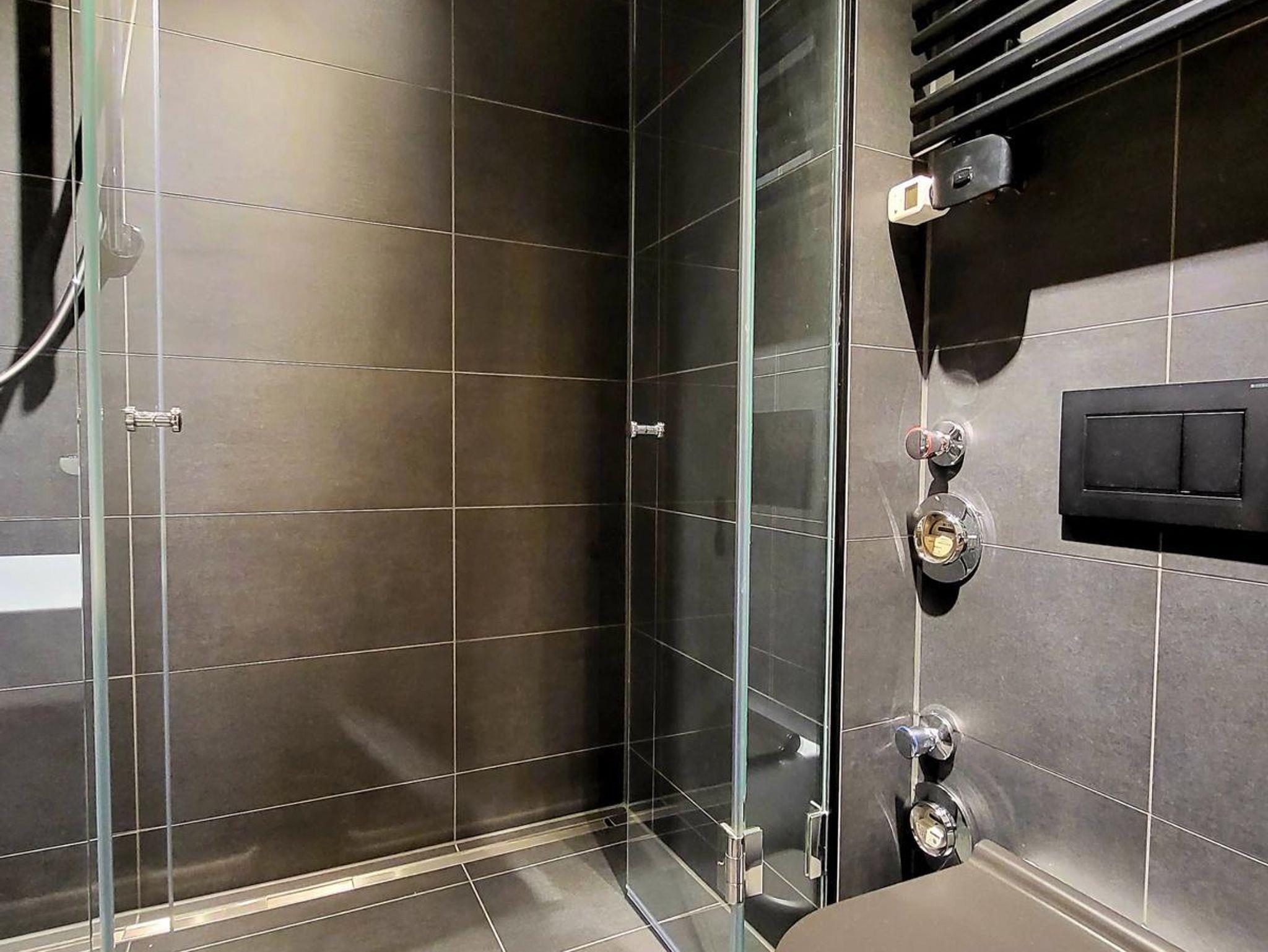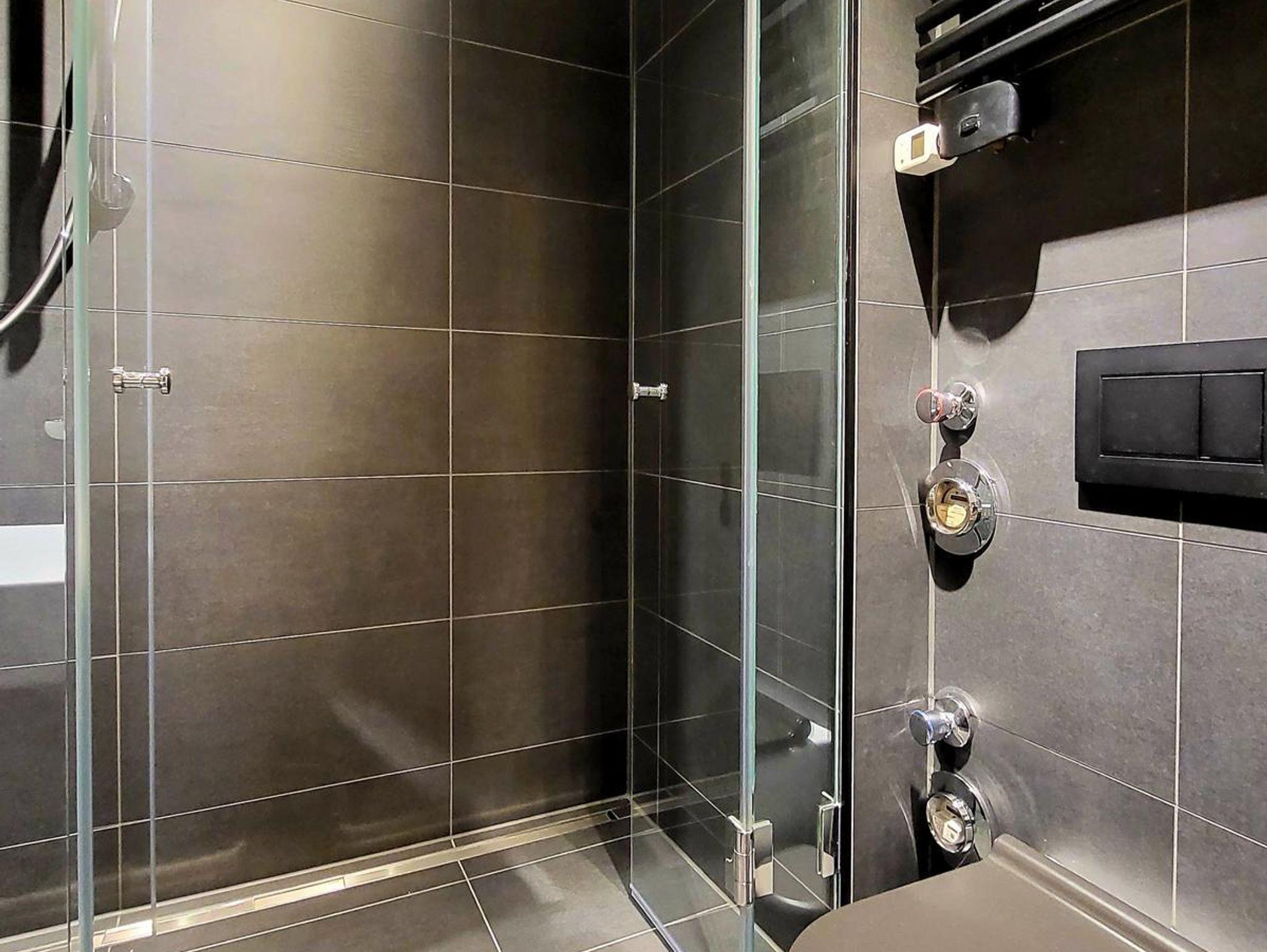 Moderne dunkelanthrazitfarbene Fliesen in Boden- und Wandbereichen.