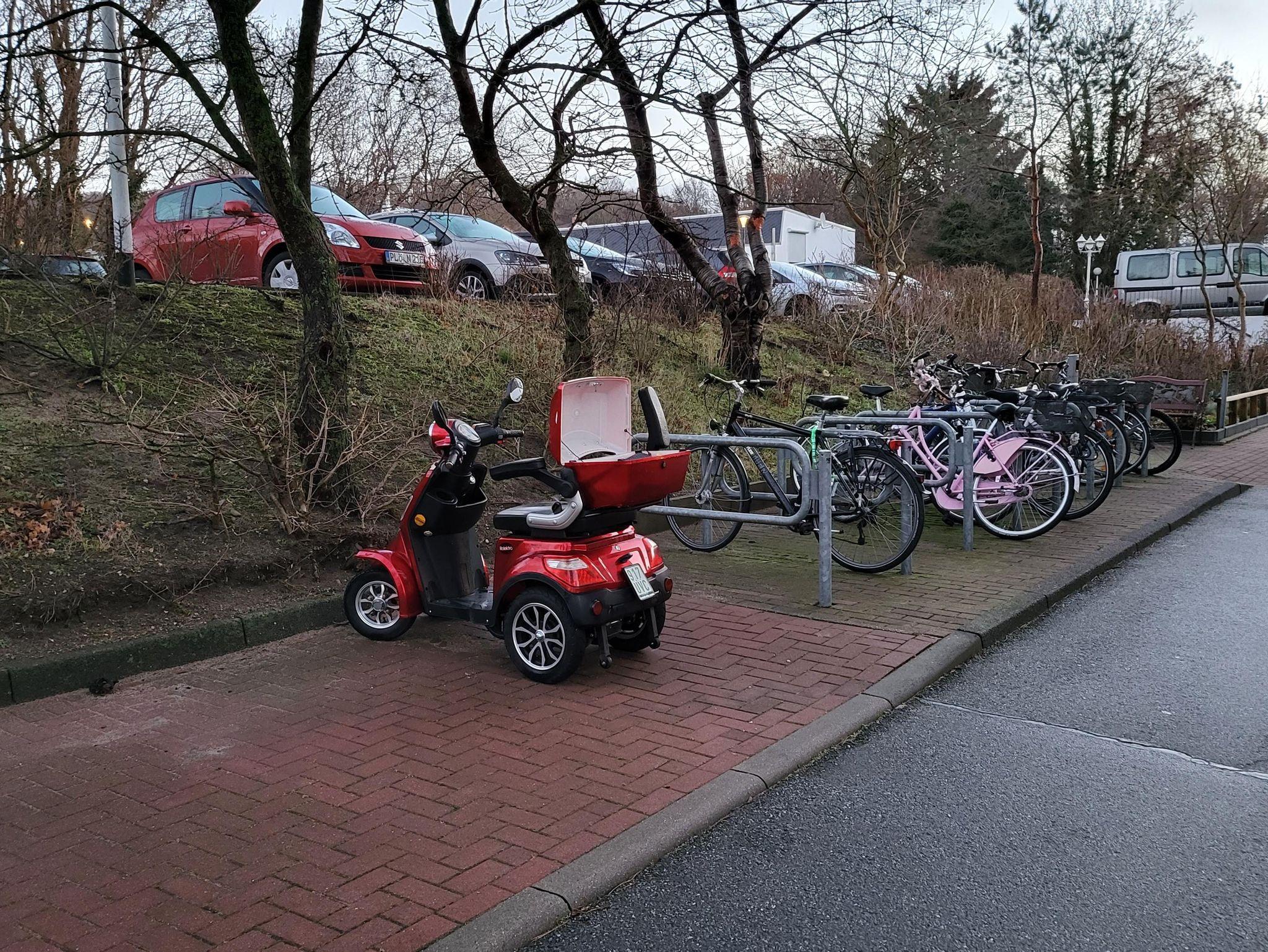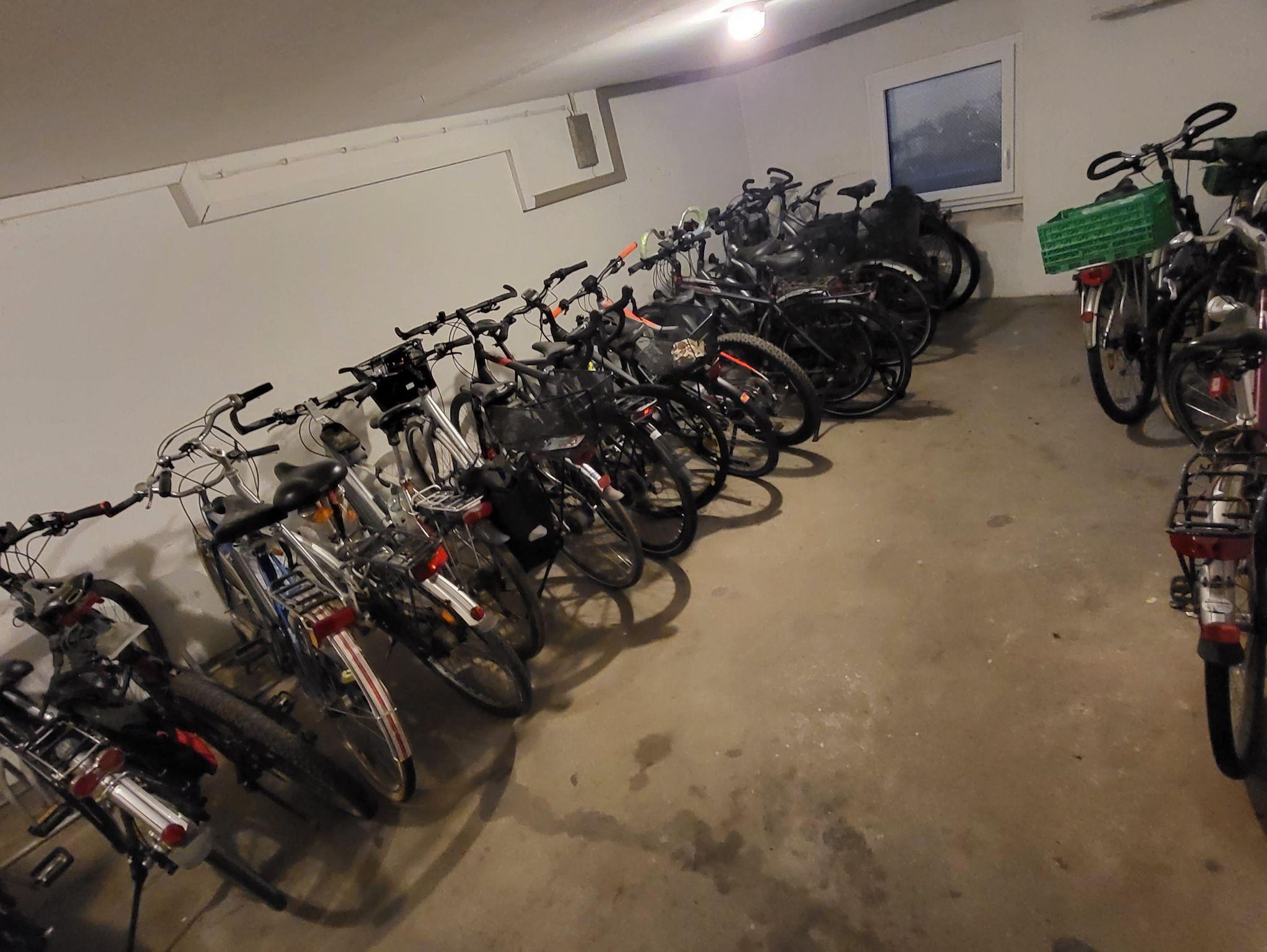 Neben dem Haupteingang befindet sich ein Fahrradkeller, sowie neben dem unten gelegenen Parkplatz von der Straße Ölmühlenallee abgehend ein Kanu-/Kajakwandständer.