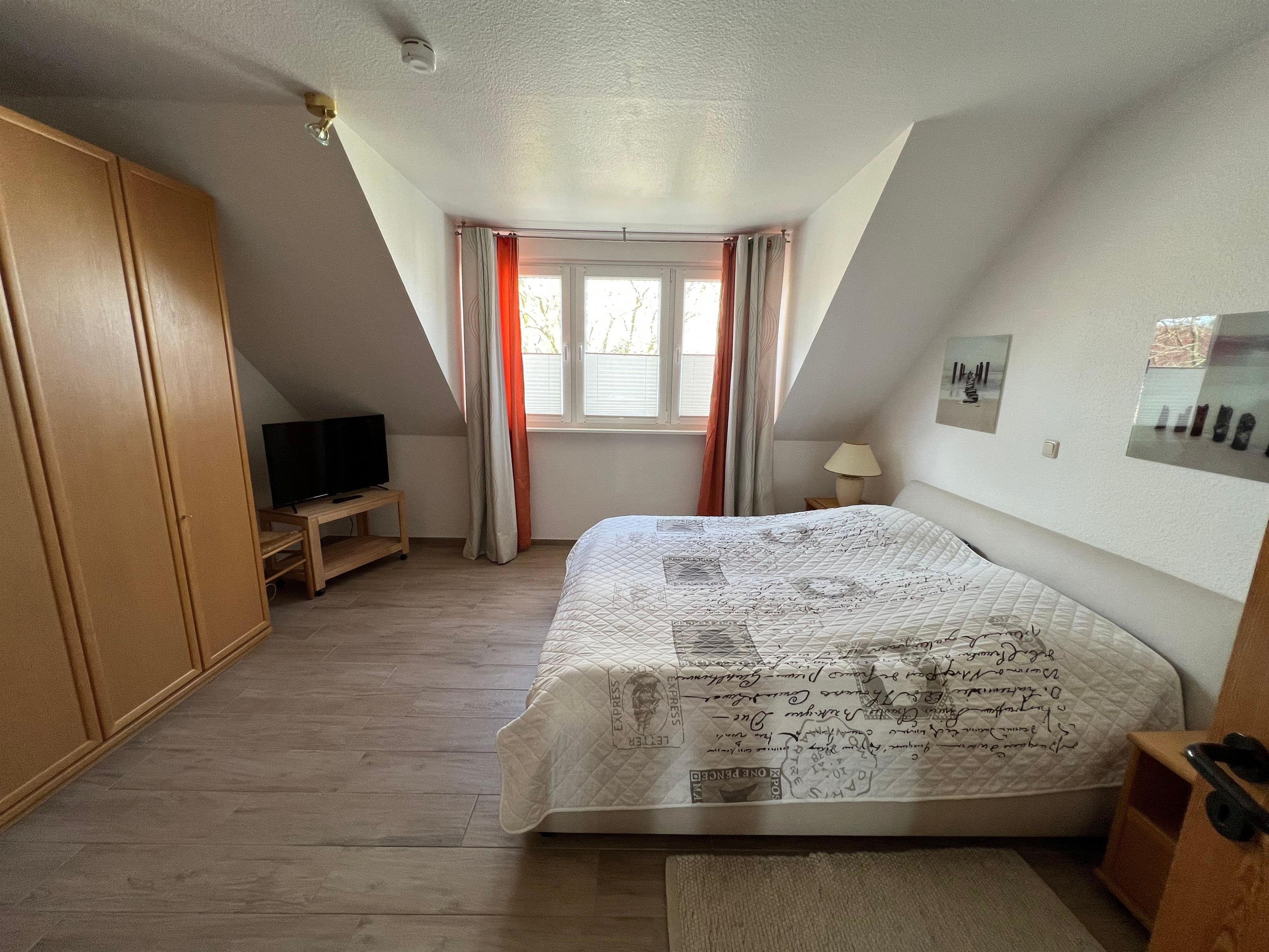 Oberschoß (2. Etage) eines gepflegten Mehrfamilienhauses. Dachgauben und Wandschrägen auf einer Seite des Wohn- und Schlafzimmers bringen gemütliche Behaglichkeit. Im Wohnzimmer sind Decke, Gaube und Schräge holzverkleidet. Die Wohnung ist ausgestattet mit einer Fußbodenheizung, Marmorfliesen, im Schlafzimmer Feinsteinzeugfliesen, einer Wohnküche mit Kühlschrank, Geschirrspüler und Sitzgruppe, einem Badezimmer mit