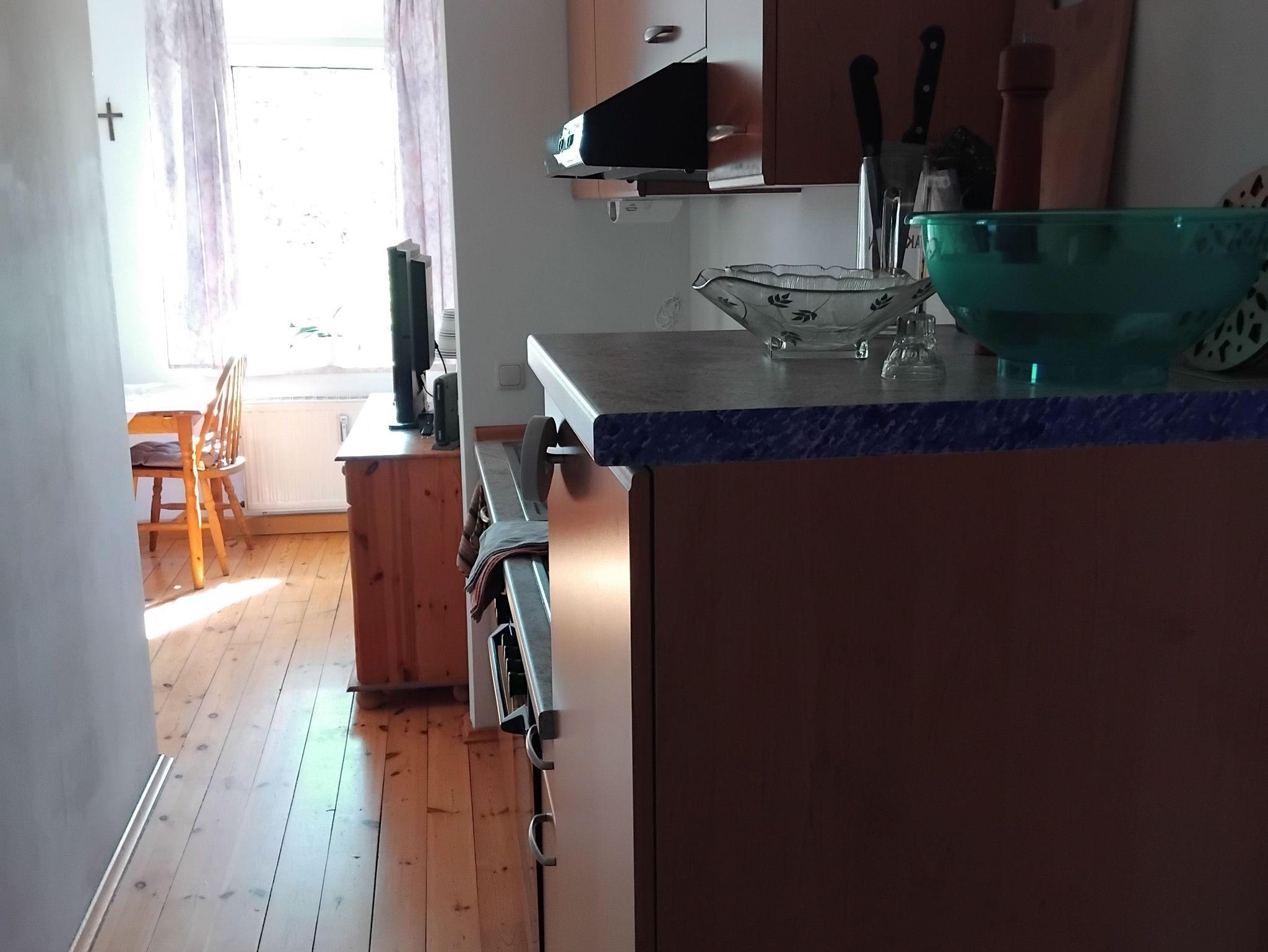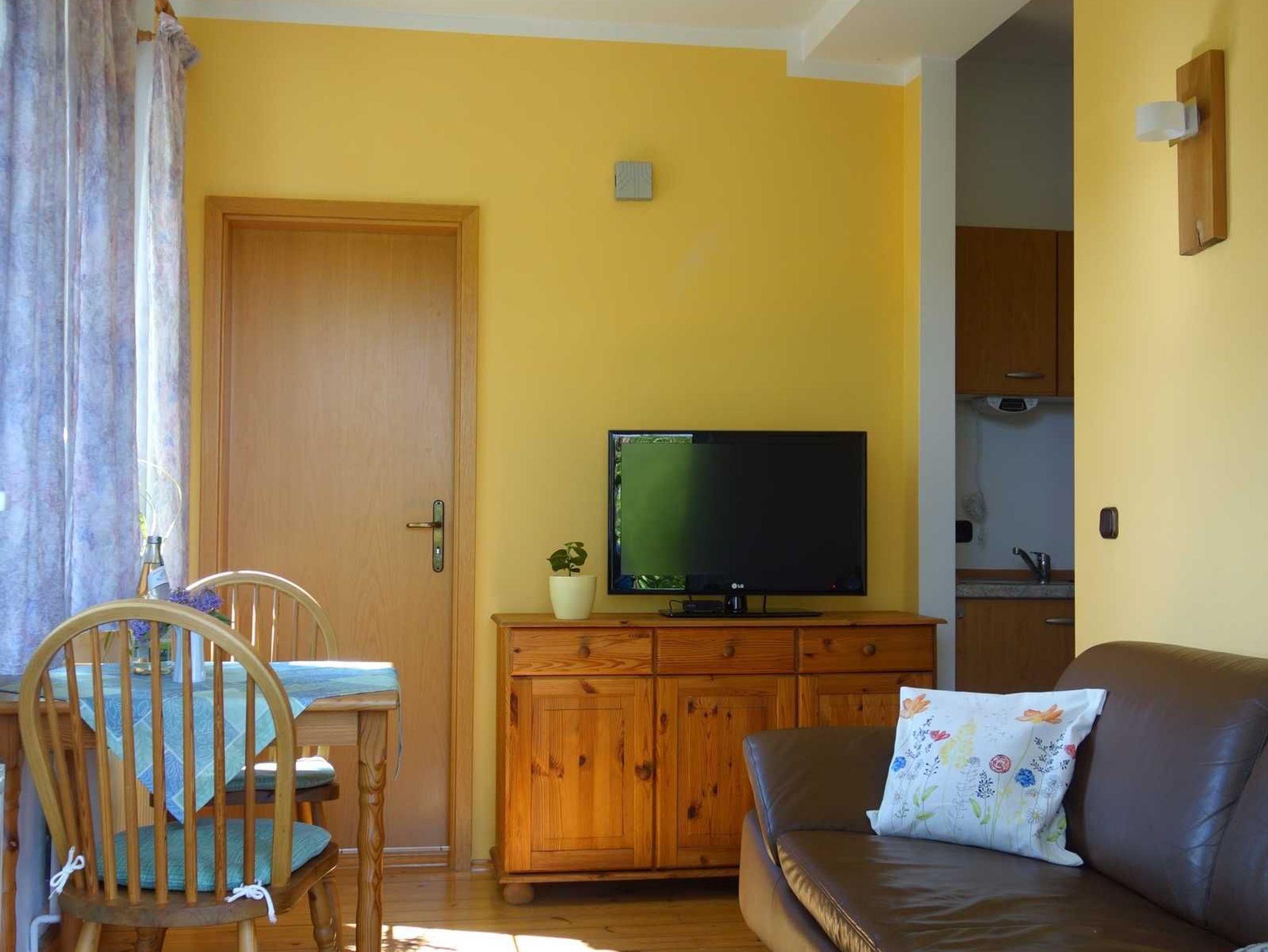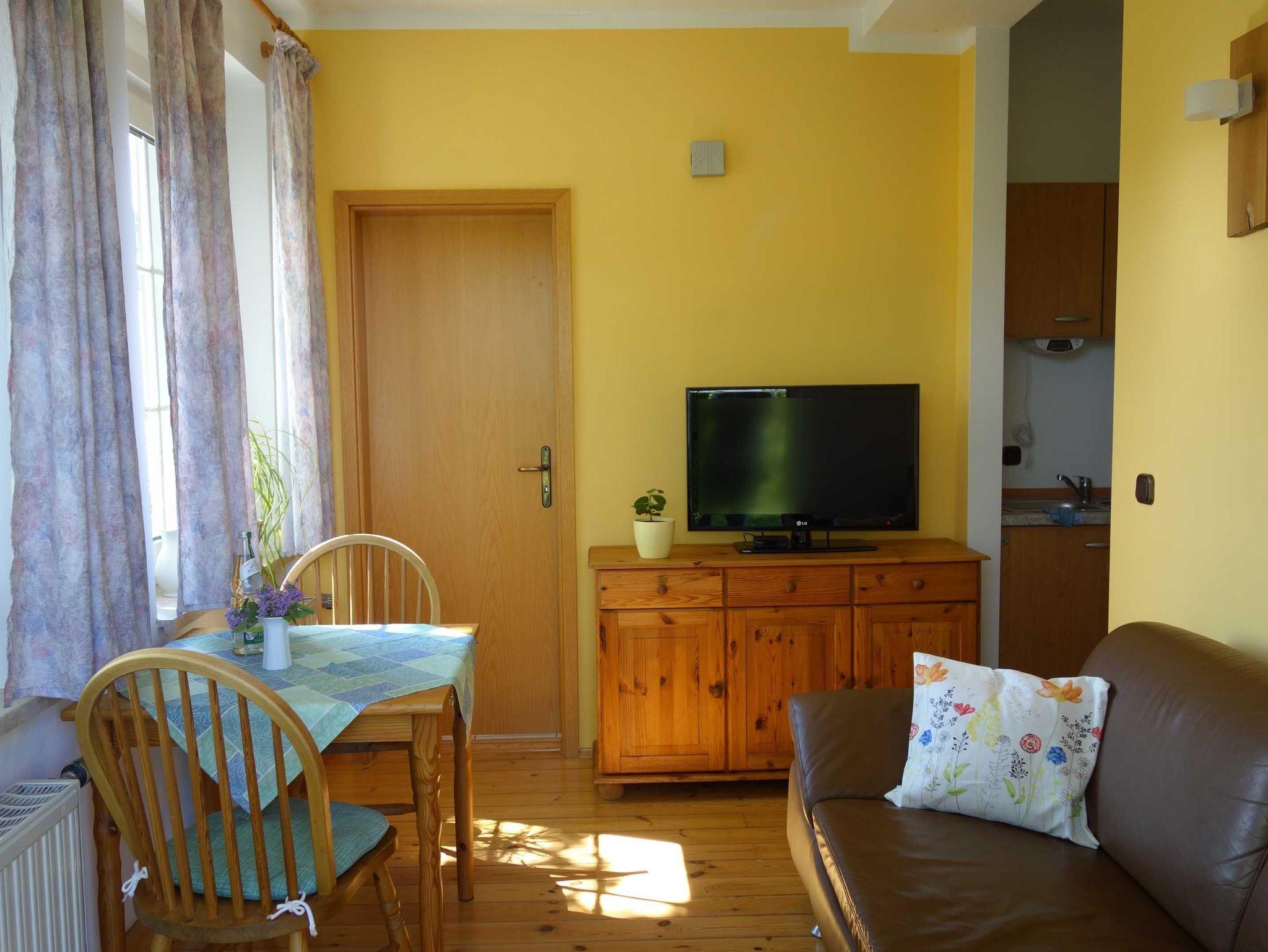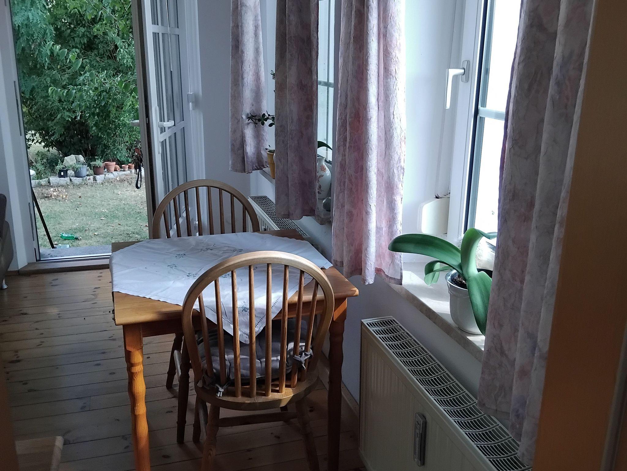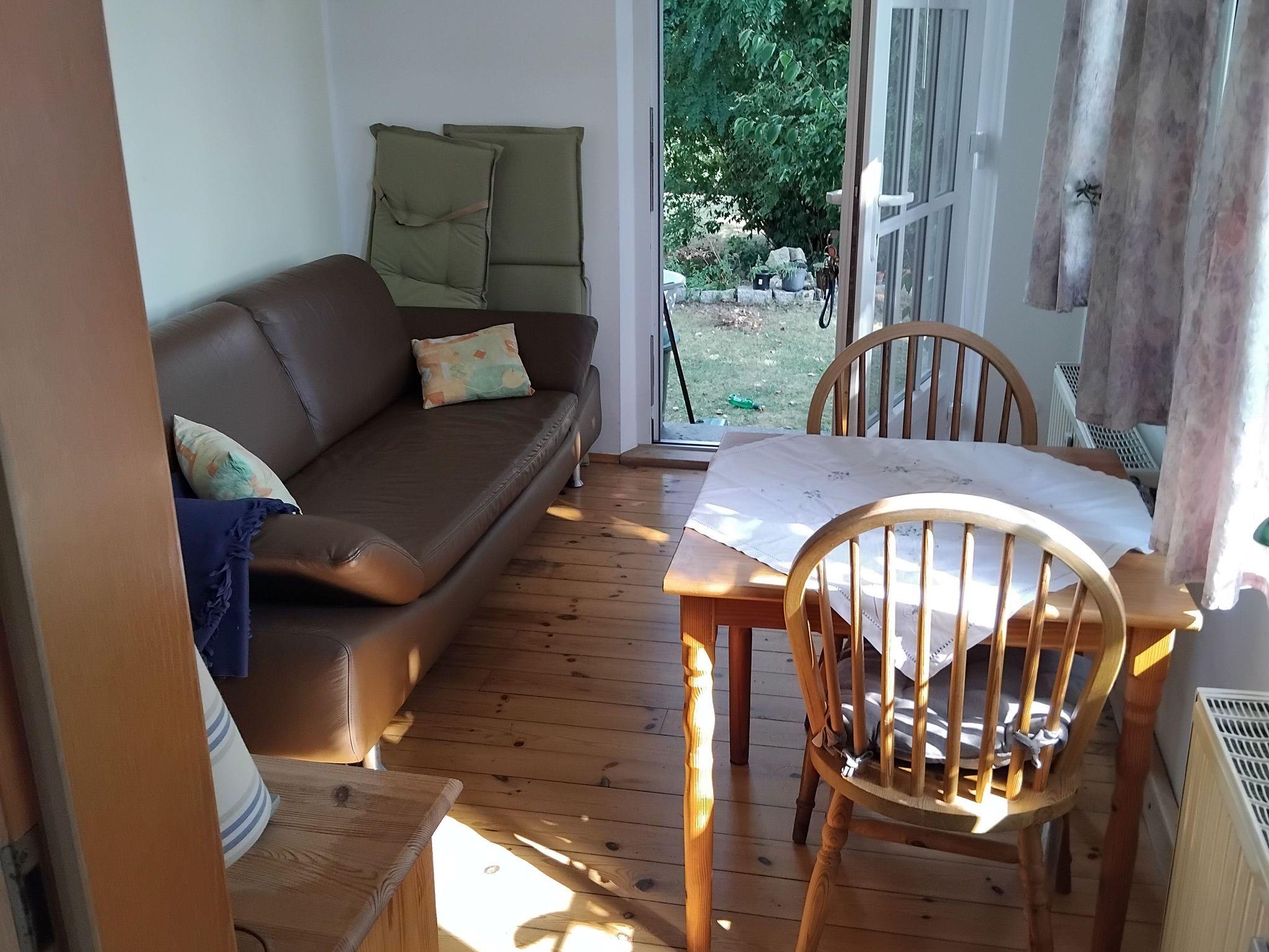 Diese helle und gemütliche Wohnung hat Süd-Ost-Ausrichtung und liegt unter dem Dach unserer alten Linde. Im separaten Schlafzimmer der Ferienwohnung finden Sie ein gemütliches Boxspringbett und einen großen Spiegelschrank vor. Zudem gibt es in der ganzen Wohnung Holzdielenboden und einen HD-TV, mit Sofa und Essecke. Ebenso verfügt die Wohnung über eine Küchenzeile mit Backofen, Herd, Wasserkocher, Kaffeemaschine. Das Badezimmer verfügt über eine Dusche und WC. Die Waschmaschine kann nach Absprache benutzt werden. Es steht ein kostenfreier Parkplatz und ebenfalls, nach Absprache, eine Unterstellmöglichkeit für Fahrräder zur Verfügung. Gegenüber befindet sich unsere Dorfkirche. Wer den schönen Klang nicht mag, bekommt kostenfrei Ohropax. Diese sind allerdings zwischen 10 am Abend und 6 in der Früh nicht notwendig. Der Naturgarten mit hohen Bäumen, der direkt an die separaten Eingänge grenzt ist ausschließlich für unsere beiden Ferienwohnungen reserviert. Singvögel, Glühwürmchen, Spitzmäuse, Wildesten, Nachbarkatze sowie ab und zu ein Eichhörnchen zählen zu den Stammgästen.