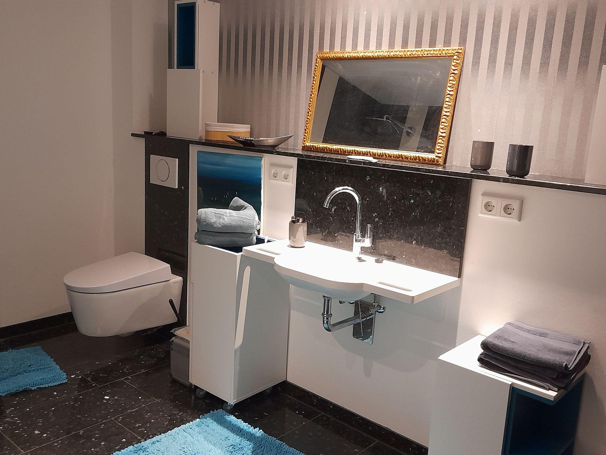 - 1 modernes Badezimmer mit ebenerdiger Dusche, 1 Gäste-WC