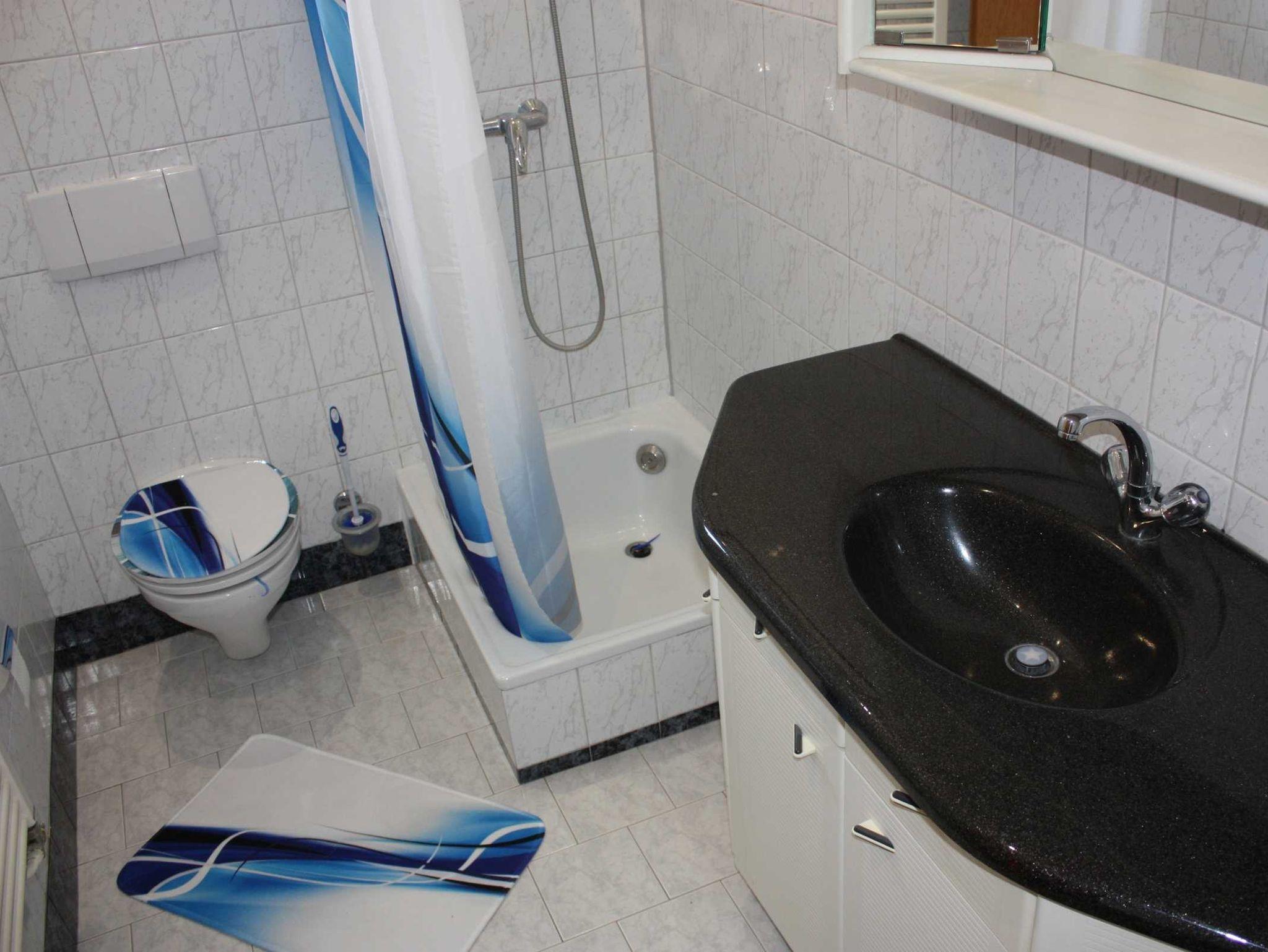 Ein Bad von ca 10 m² mit Waschtisch, Dusche und WC gehört zur FW.