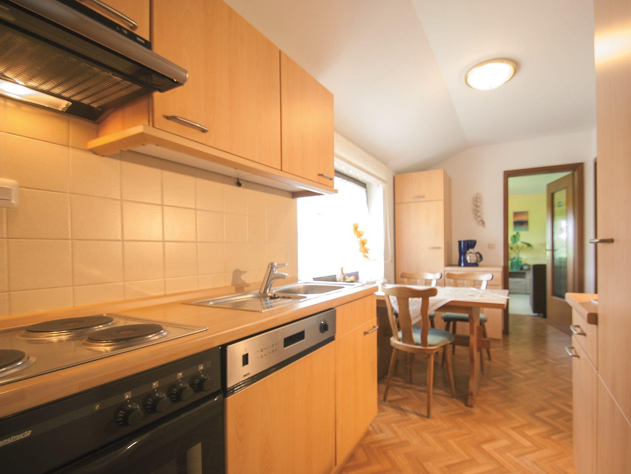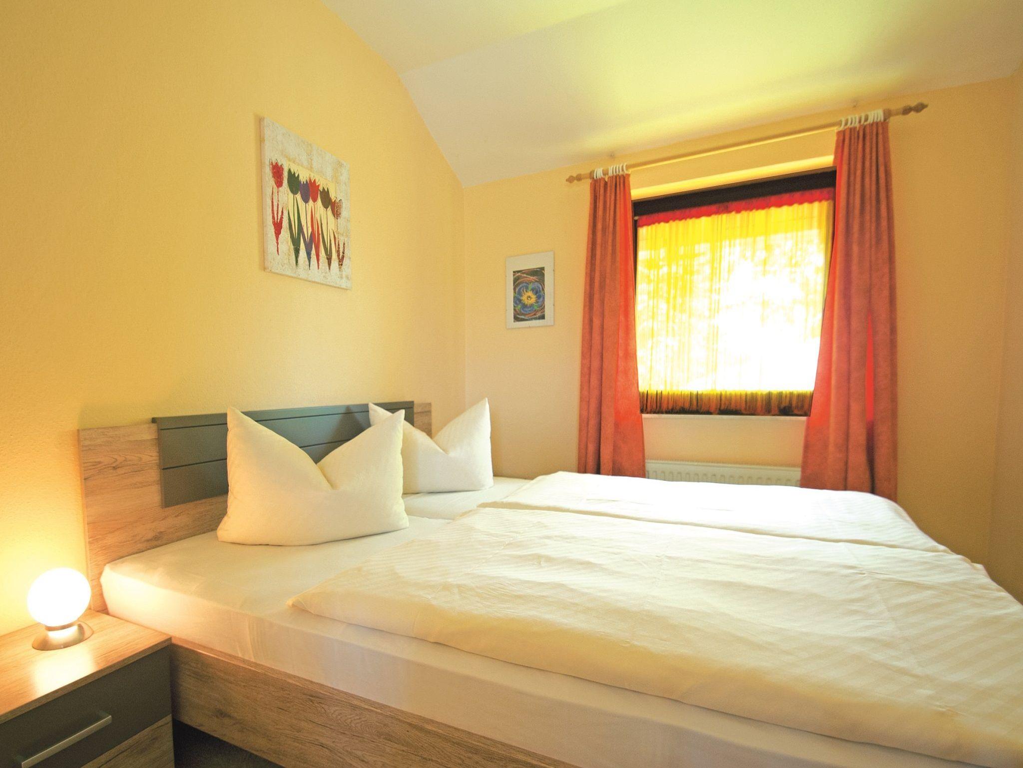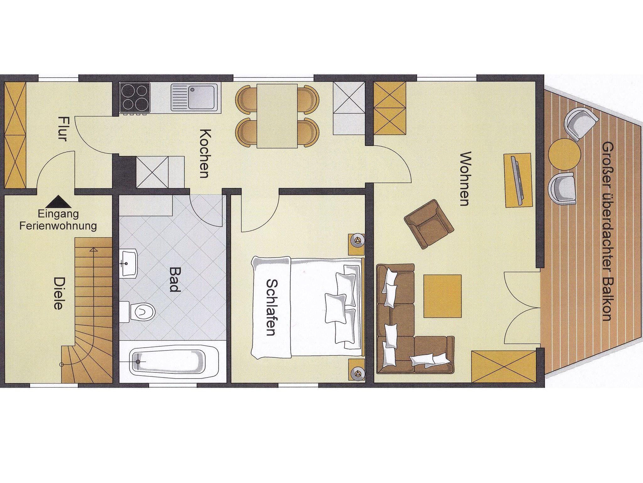 Die Fewo befindet sich im 1. Geschoss und verfügt über 1 Schlafzimmer, 1 Wohnraum mit Couch und TV, 1 Badezimmer mit Badewanne/WC, Küche ( mit Geschirrspüler, 4-Platten E-Herd) und großem überdachten Balkon.