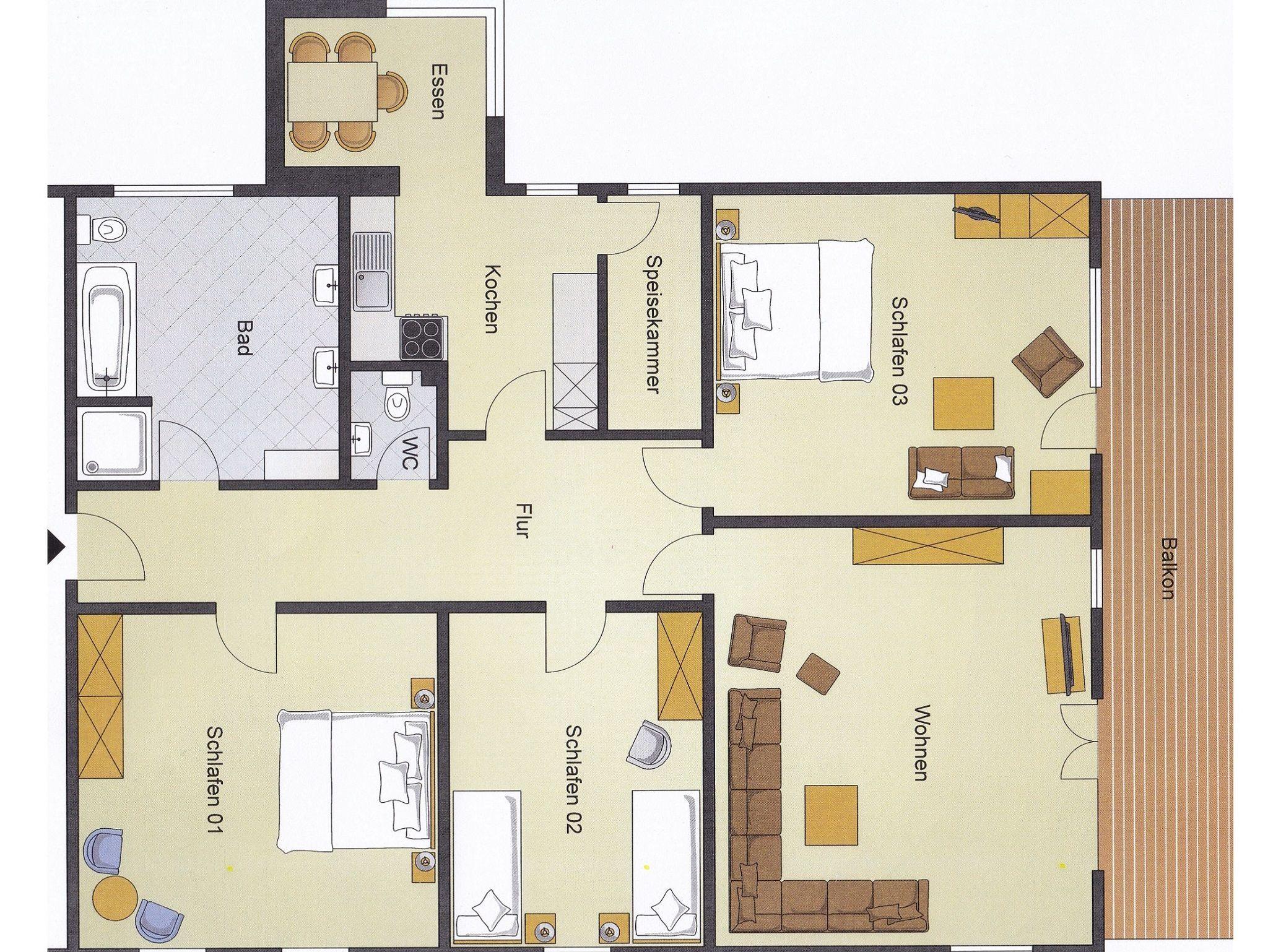 Die Ferienwohnung verfügt über 3 separate Schlafräume, 1 Wohnraum mit Couch und TV, 1 Badezimmer mit Badewanne und DU/WC, 1 Gäste WC, Küche mit Geschirrspüler, 4-Platten E-Herd und Essecke,