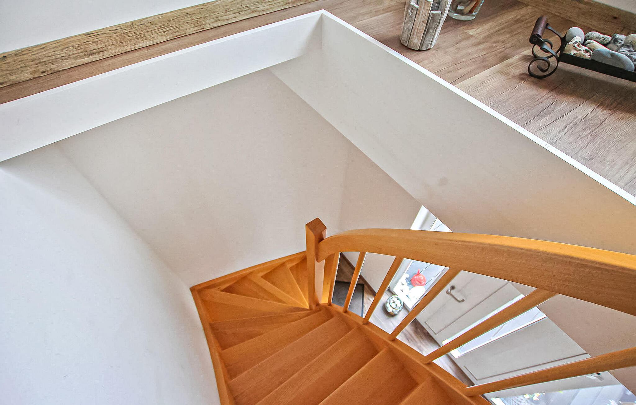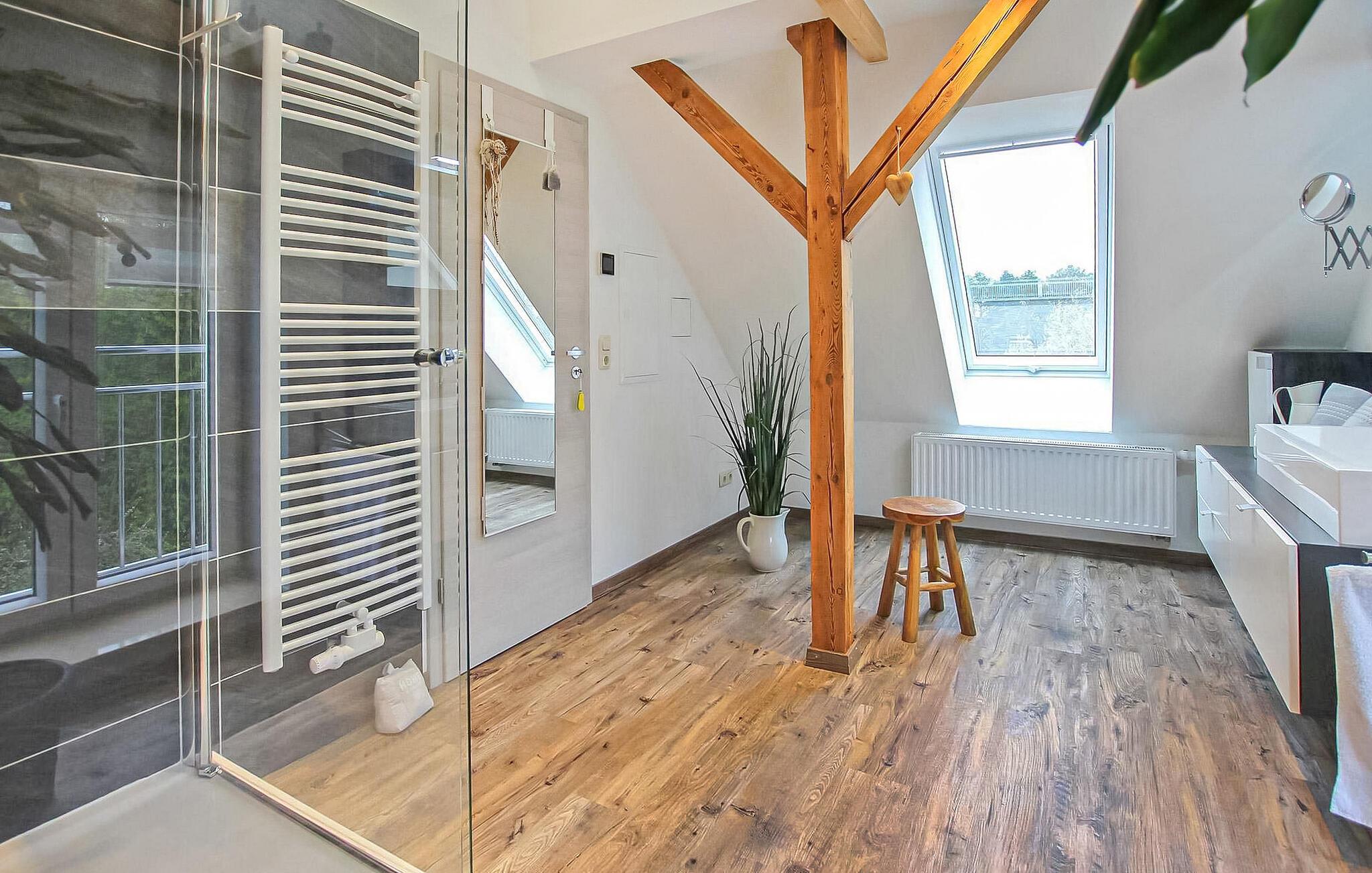 Den ikke-ryger lejlighed, som blev totalrenoveret i 2021 og er centralt opvarmet og udstyret med insektbeskyttelse, er på ca 50 kvadratmeter i størrelse og kan nås via en separat udvendig vindeltrappe fordelt på tre niveauer. I den første er der entre med garderobe og tilstrækkelig opbevaringsplads, i den anden er der den store stue (sovesofa, skrivebord, fladskærms-tv, radio) med åbent, moderne køkken (spiseplads, el-komfur med ovn, køleskab med fryser mulighed, opvaskemaskine, mikroovn, diverse små køkkenmaskiner) samt rummeligt badeværelse (bruser, toilet, elektrisk håndklædevarmer, hårtørrer) og i det tredje (tilgængelig via trappe) det åbne soveområde (to madrasser) .