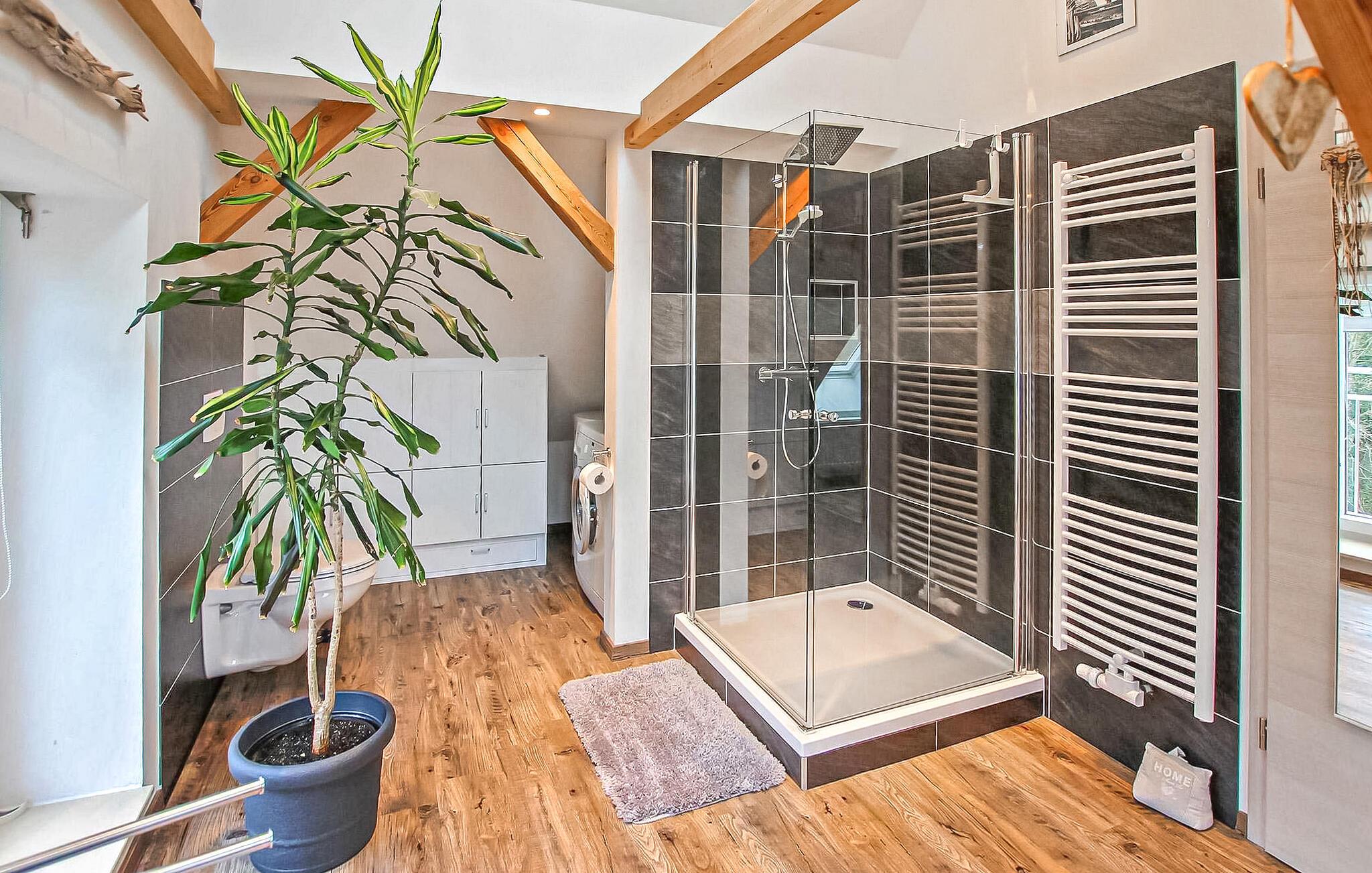 Derudover er der en cirka 30 kvadratmeter møbleret tagterrasse med udsigt over søen, en gasgrill, parkering; Cykelopbevaring og en privat anløbsbro ved Plötzensee (bademulighed for svømmere) er til rådighed. WiFi er også tilgængeligt. Den samlede pris inkluderer slutrengøring, vand- og energiforbrug samt sengelinned og håndklæder (første levering). Betales på stedet: turistskat. Kæledyr er ikke tilladt i denne ejendom. Det klimatiske kursted Plau am See, som "porten" til Mecklenburg Lake District, har en lang tradition som feriested. Med sine 38,4 km² er søen af samme navn den tredjestørste i Mecklenburg-Vorpommern og byder på de bedste betingelser for vandsportsentusiaster og hobbyfiskere. Det bakkede område med skove og andre små eller større søer byder på mange andre udflugtsmuligheder til fods eller på cykel.Naturparken Nossentiner/Schwinzer Heide begynder på den nordlige bred af Plauer-søen og er et populært udflugtsmål, som er detaljeret beskrevet i "Karower Meiler", udsigtstårnet "Moorochse" lige ved søen. I selve Plau er der flere badestrande, båd- og cykeludlejning, dykker- og sejlerskoler, klatreparker, passagerbådsture og fisketilbud. Den maleriske gamle bydel, som stadig i dag er præget af landbrugsborgernes bindingsværks- og murstenshuse, inviterer til at slentre rundt med talrige restauranter, caféer og indkøbsmuligheder. Foruden løftebroen er borgtårnet med volde, den protestantiske bykirke "St. Marien" fra det 13. århundrede og Plauer rådhus i stil med den hollandske renæssance fremragende samtidsvidner. Det seneste højdepunkt er udsigtstårnet direkte ved overgangen fra Müritz-Elde-vandvejen til Plauer-søen.