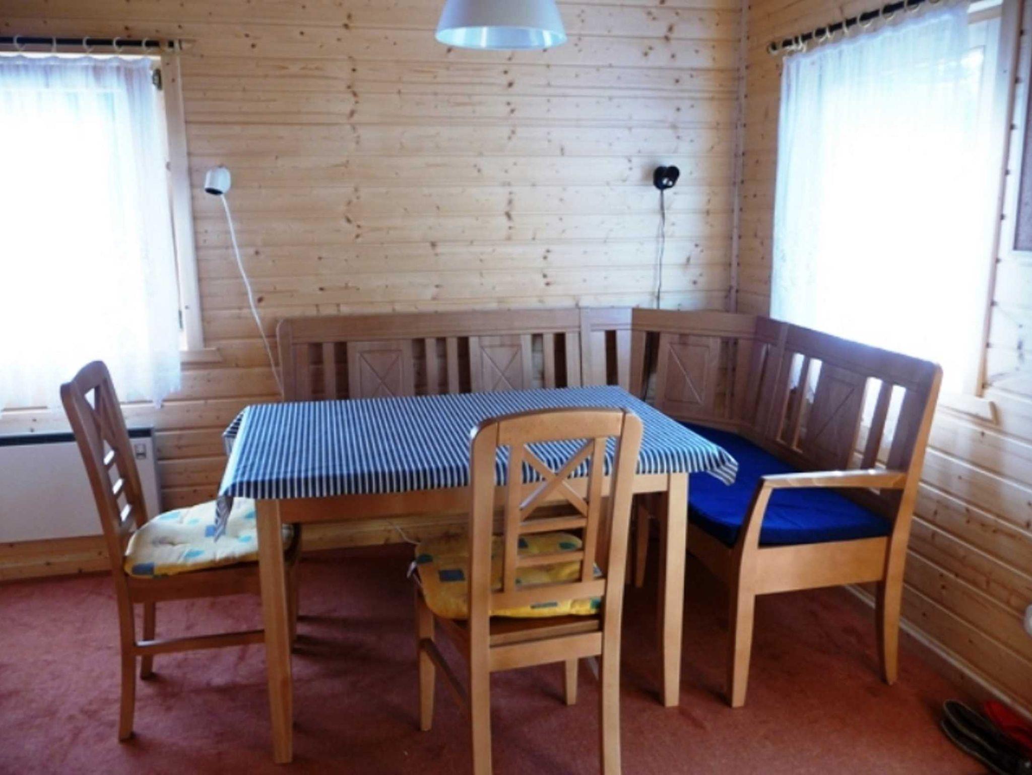 Ferienhaus bis 3 Personen, Wohnbereich mit Essecke, Schlafboden mit 3 Matratzen, sep. Küche, Dusche/WC.
