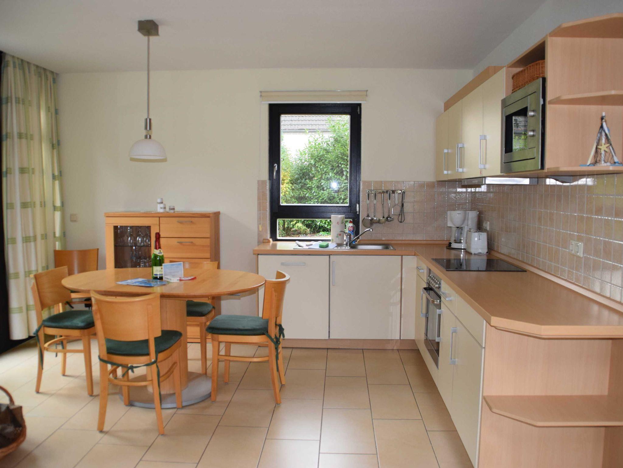Im EG befindet sich ein Duschbad mit Sauna und die Küche mit Wohn -und Essbereich und einem Kamin.