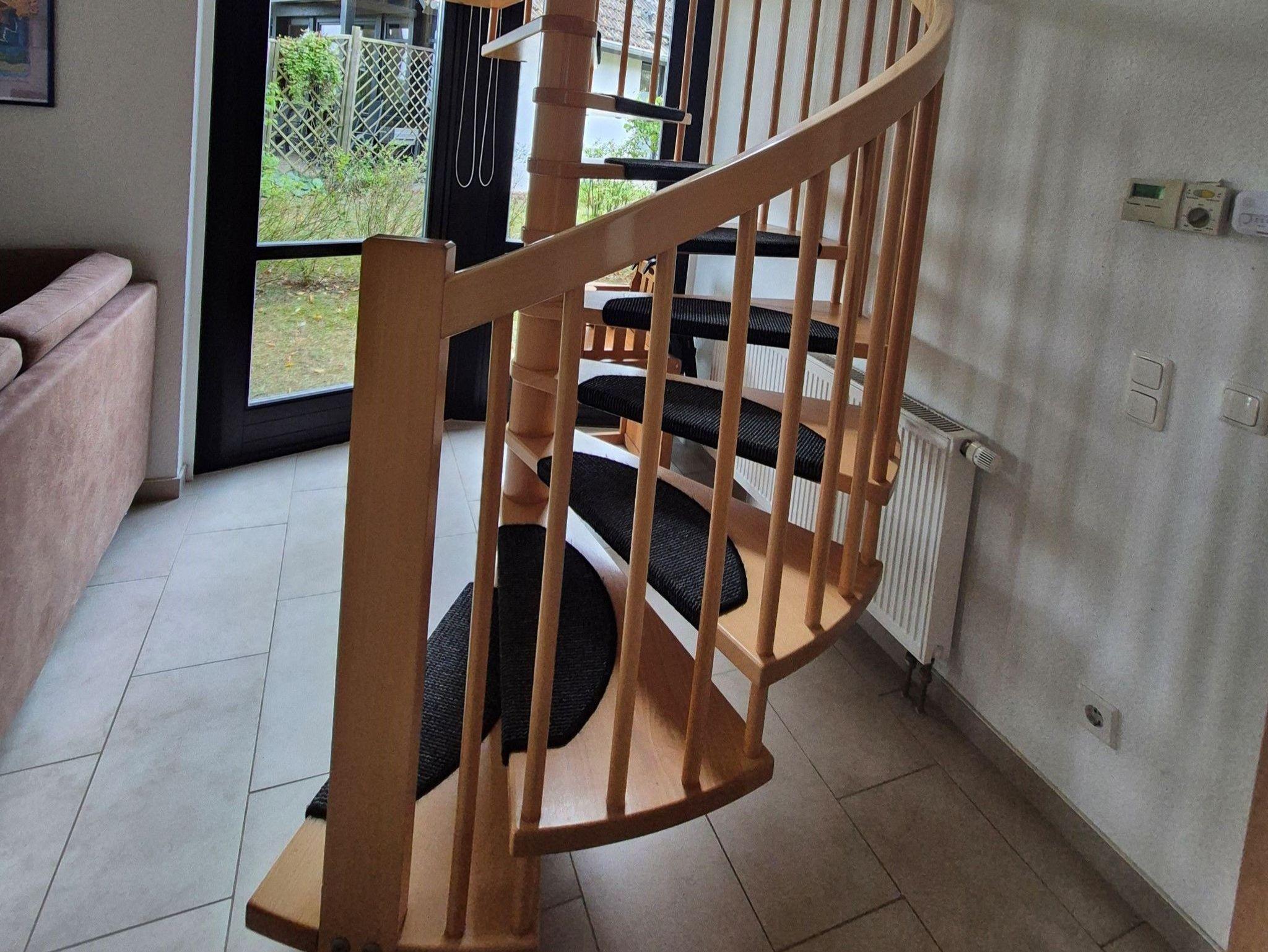 Eine stabile Wendeltreppe führt ins OG. Hier befindet sich ein SZ mit Balkon mit einem Doppelbett und Blick