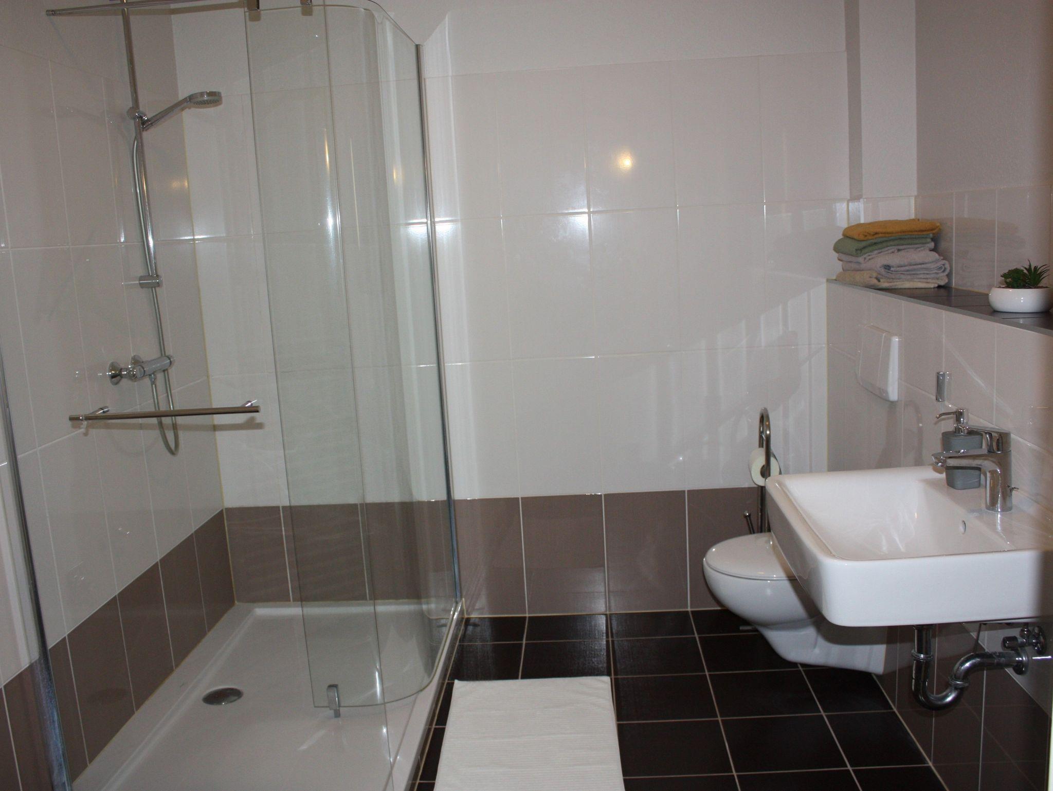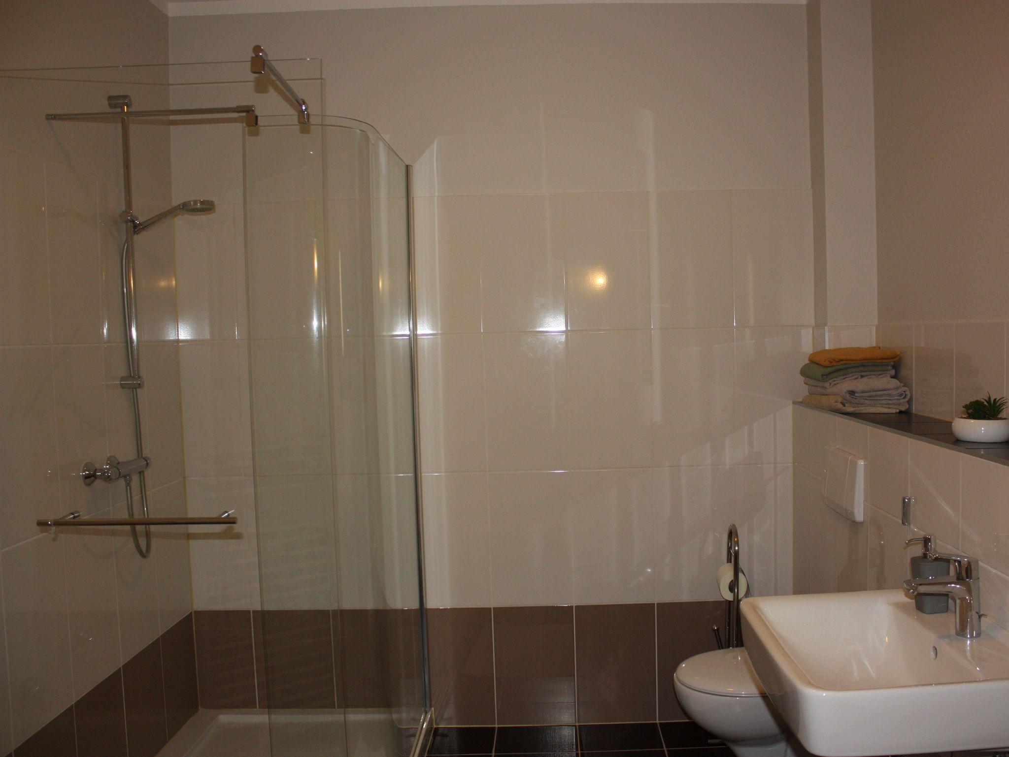 Im Badezimmer befinden sich eine Dusche und ein WC.