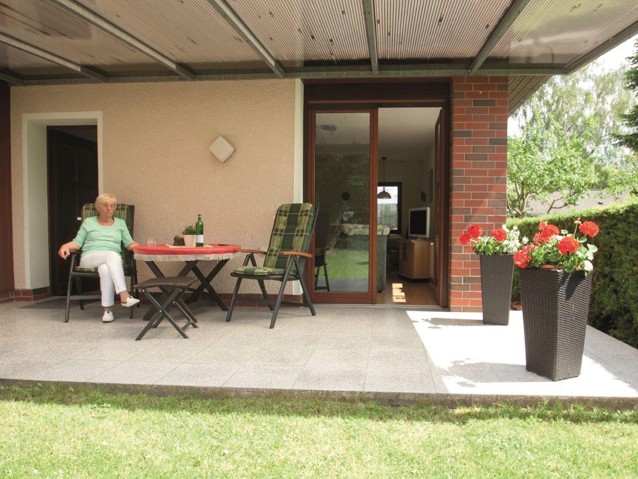 Die überdachte Terrasse mit Gartenmöbeln lädt zum Grillen und Entspannen ein. Zum Ferienhaus gehört ein Parkplatz und eine verschließbare Fahrradunterstellmöglichkeit. Das Grundstück vom Ferienhaus ist umzäunt. Hunde sind gegen Aufpreis möglich.