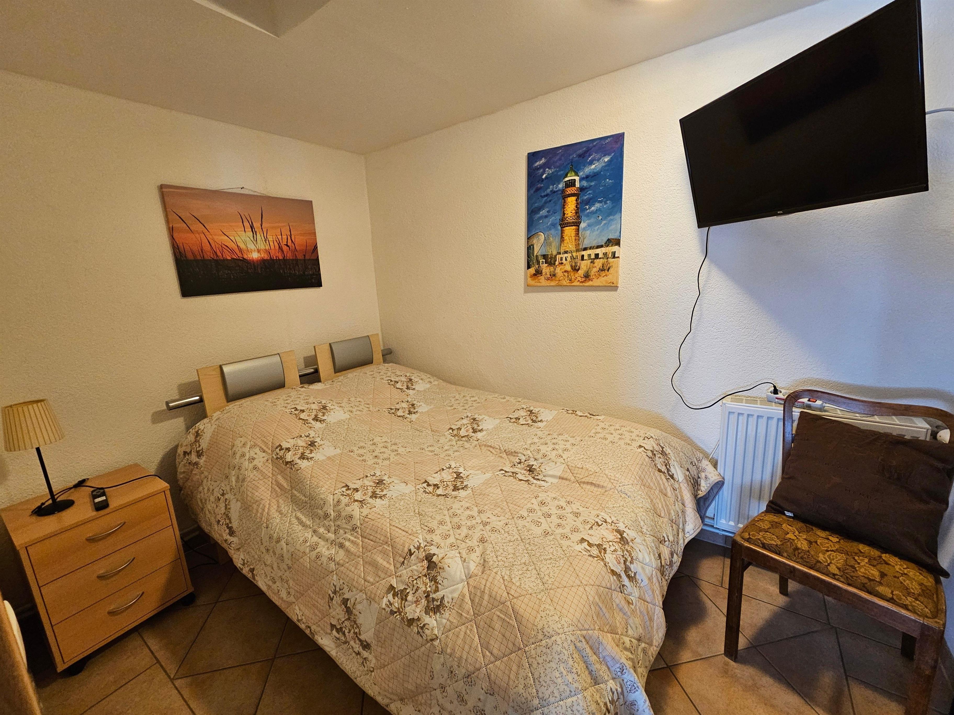 Doppelbett, Nachtschrank, Flachbildferseher, begehbarer Schrank