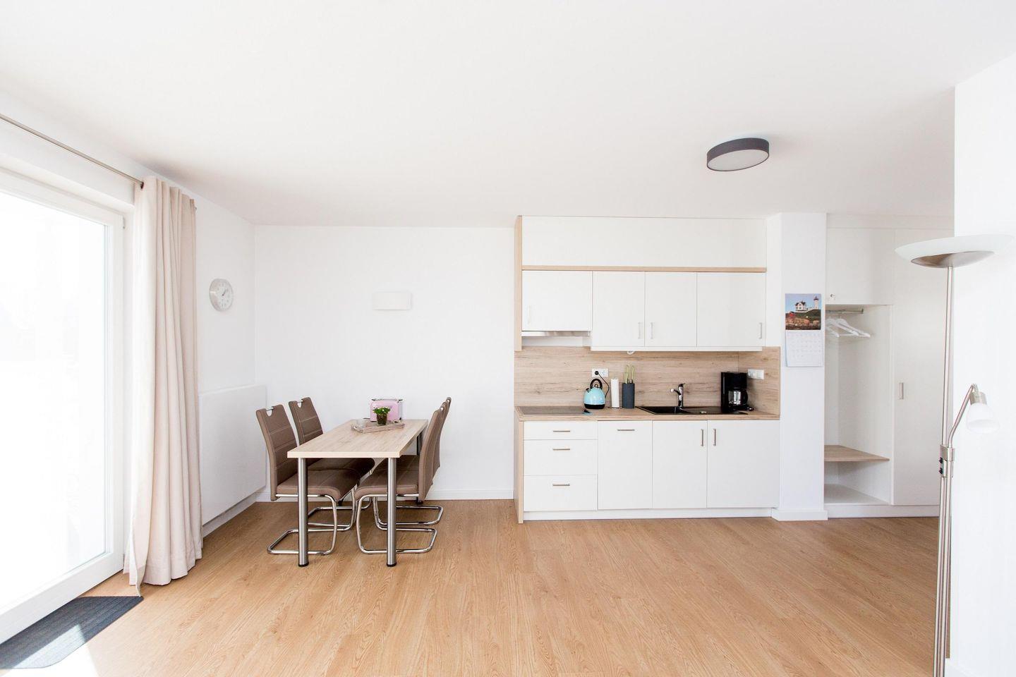 Das ca. 62 qm große Apartment teilt sich wie folgt auf: Wohn-Essbereich mit Küchenzeile,