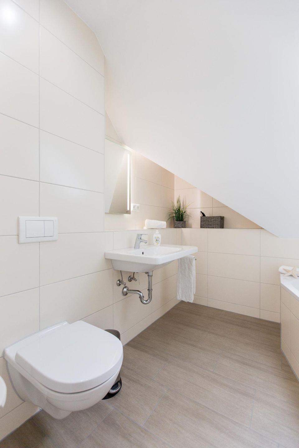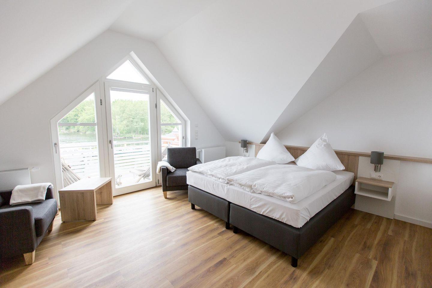 Im Dachgeschoss liegen ein Tageslichtbad mit Badewanne sowie zwei weitere Schlafzimmer mit jeweils einem Boxspringbett (1,80 m x 2,00 m). Das traumhafte Schlafzimmer zur Seeseite besitzt zusätzlich einen weiteren Balkonzugang. Von hier aus fasziniert Sie ein grandioser Blick auf den Plauer See. In den gemütlichen Balkonsesseln können Sie die Seele bei einem guten Glas Wein baumeln und den Alltag hinter sich lassen.