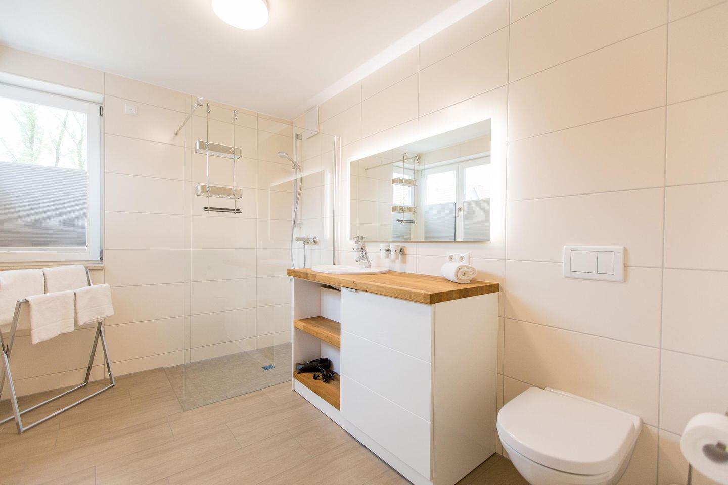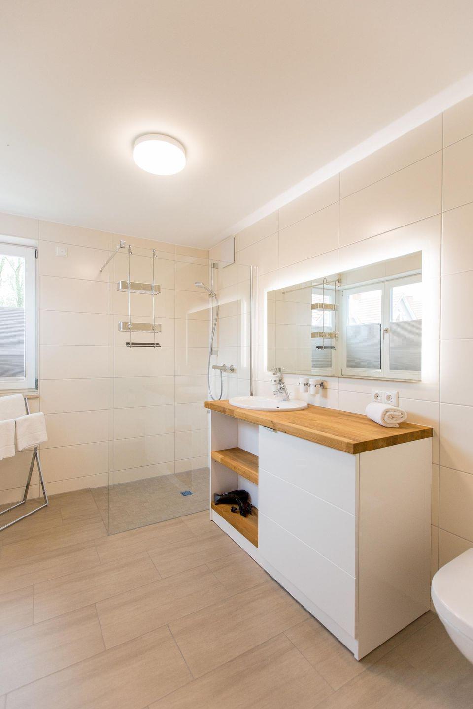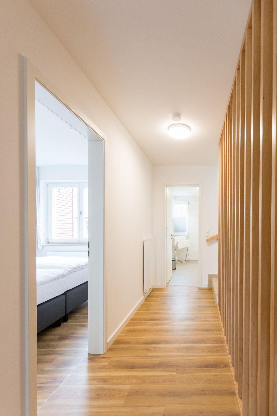 Die Wohnfläche von 103 m² erstreckt sich über zwei Stockwerke. In der ersten Etage im OG befinden sich ein großzügiges Tageslichtbad mit bodengleicher Dusche, ein Schlafzimmer mit einem Boxspringbett (1,80 m x 2,00 m), ein großer Ess-Wohnbereich mit integrierter Küchenzeile, sowie ein großer Balkon.