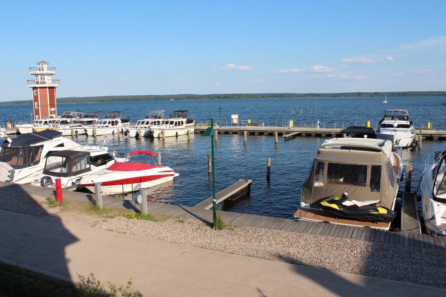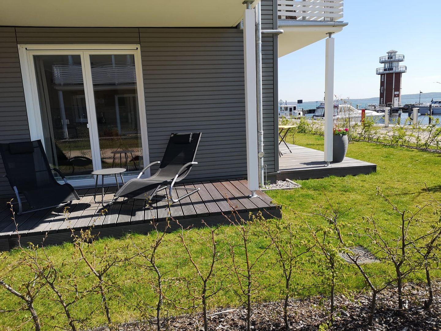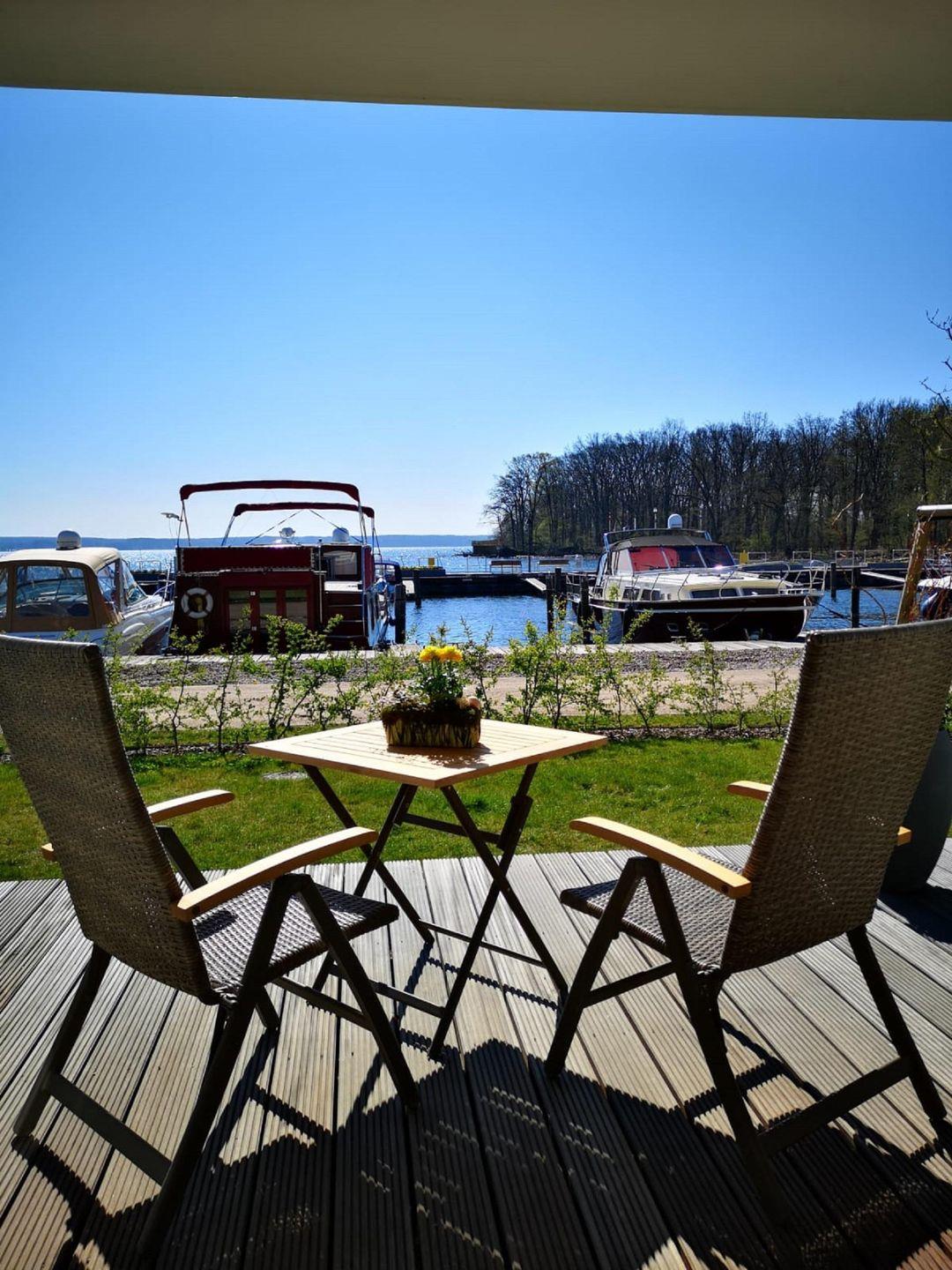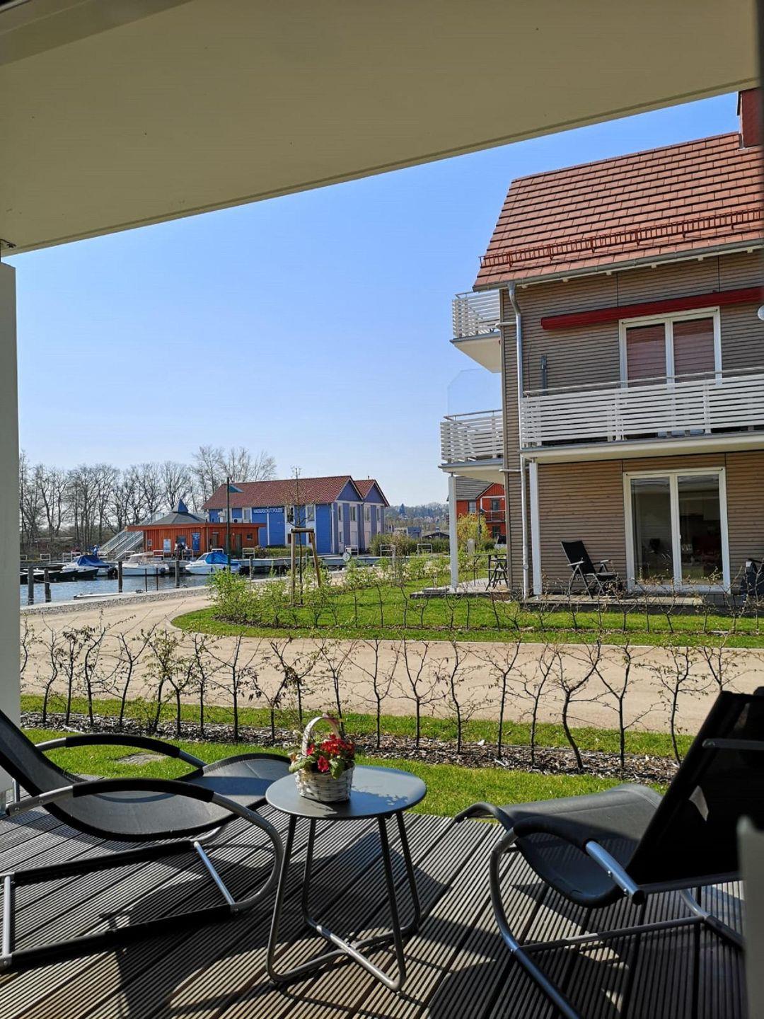 Das Panorama-Apartment liegt im Parterre in Haus 7 und genießt eine traumhafte Aussicht auf den neuen Hafen, den Aussichtsturm und den Plauer See.